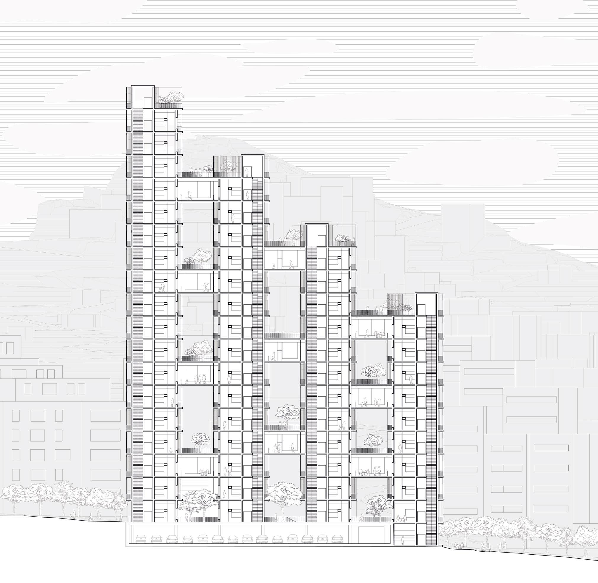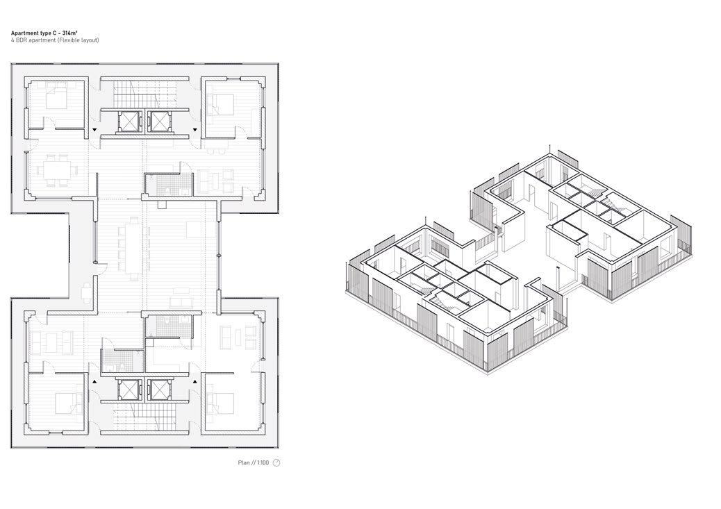 The residential program consist of a mix of 1, 2 and 4 BDR apartments, some with shared living rooms to support small communities or families within the building. In addition, all residents have access to common spaces such as kitchens, a gym, a library, and co-working areas. These shared facilities are designed to strengthen social connections & create a vibrant living environment
