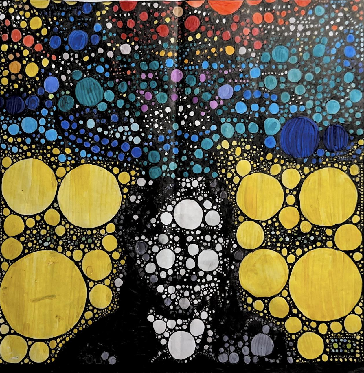Students discovered an album cover that inspired them to create circular patterns. They used this design as a foundation, filling in the circles with vibrant Copic markers to bring their vision to life. Once they completed the coloring, they traced over the patterns with black Micron pens, adding a polished and defined look to their artwork.