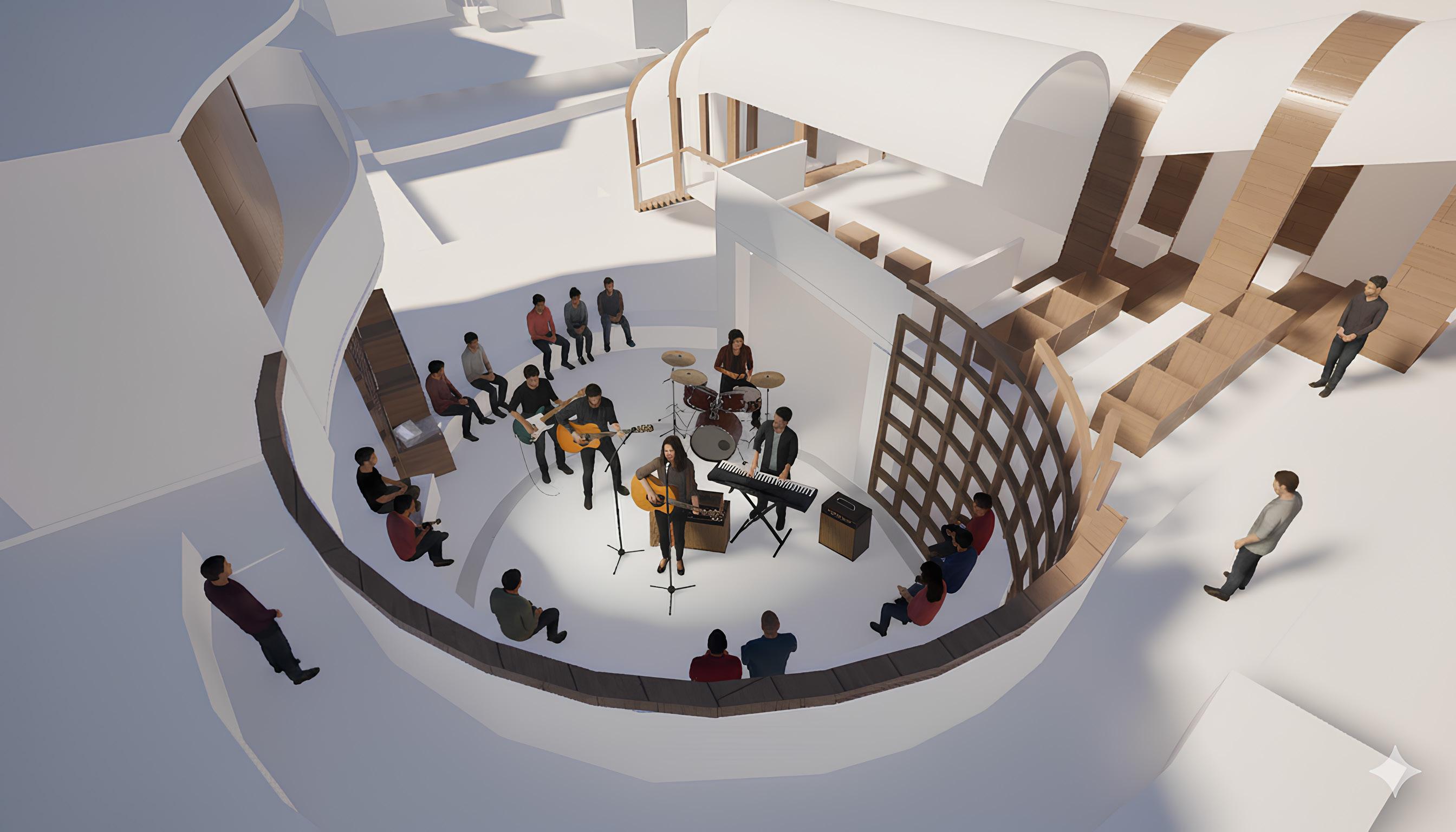 The design builds upon existing community elements, such as the circular sheltered walkways, extending them into a larger spatial system. Circular geometry becomes both a formal and organizational strategy, informing the design of elevated skywalks that guide circulation and link different zones.