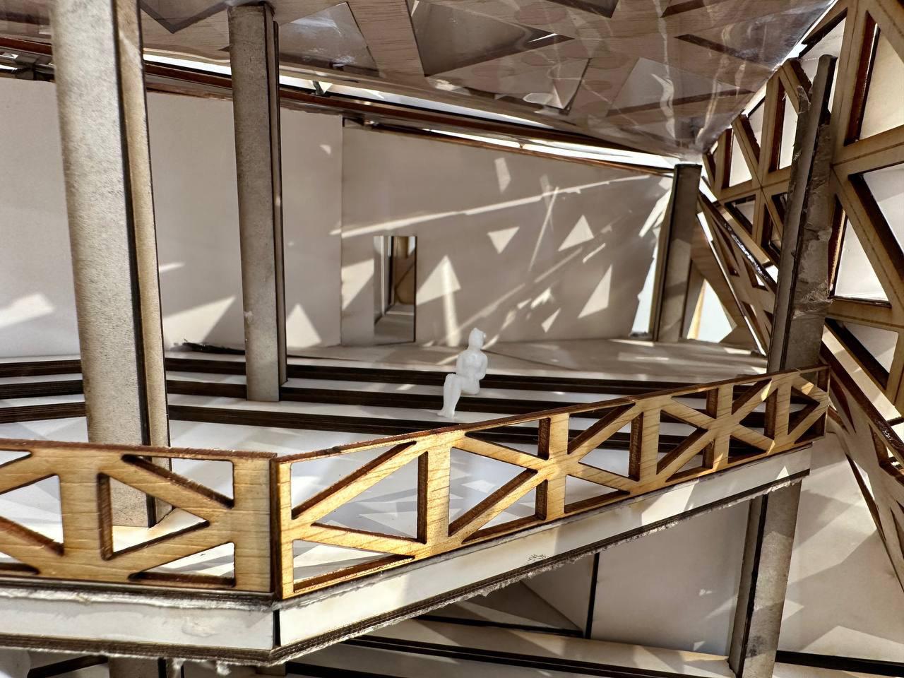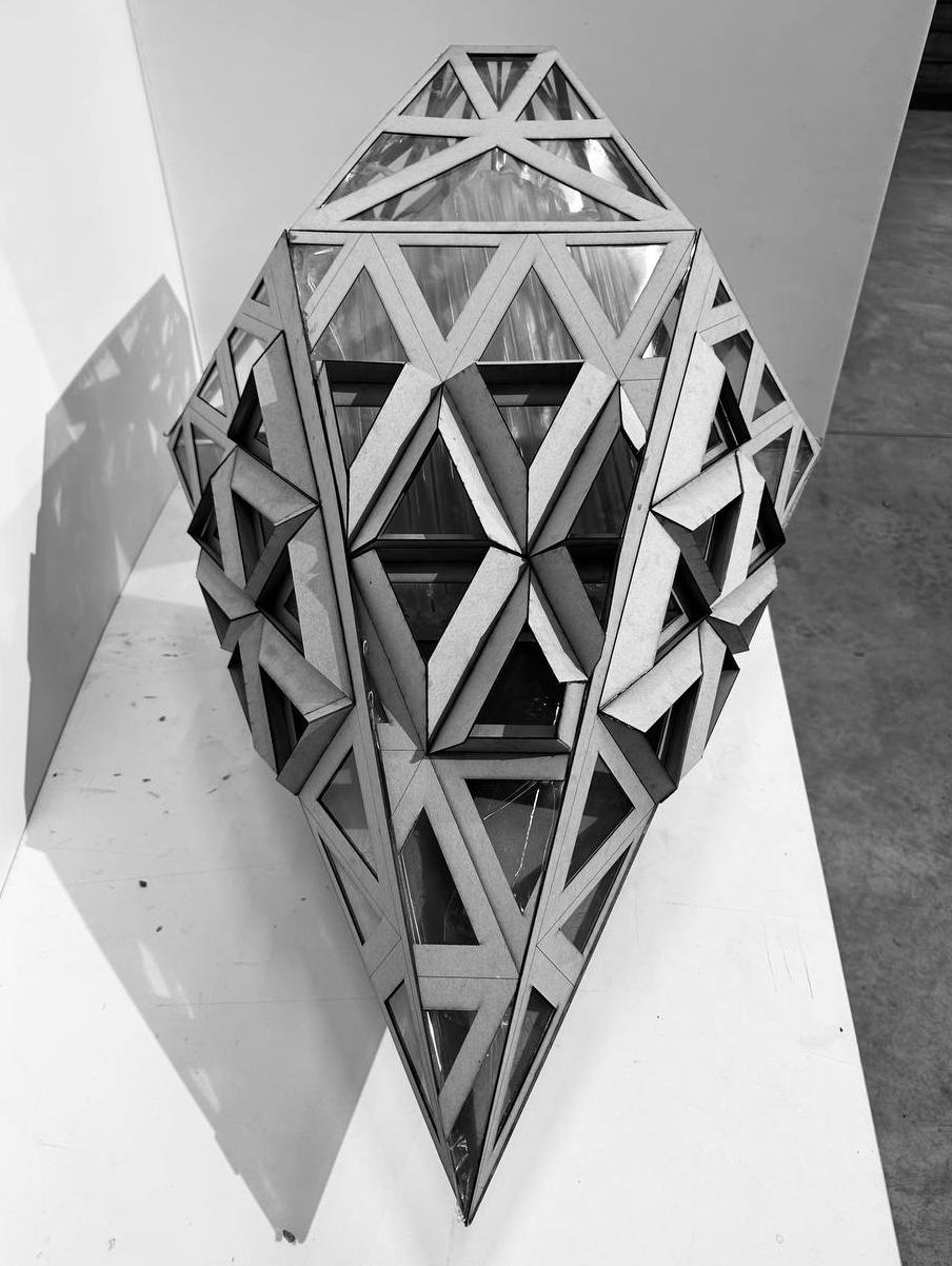 Each triangular module varies in size, density, and angle based on solar exposure and wind direction, creating a gradient of brightness and ventilation across the façade. Areas requiring focused, quiet work. Such as private study rooms or offices are shielded with tighter, smaller fins to reduce glare and create calm, softly lit environments. In contrast, communal zones like seminar rooms or shared lounges open up to daylight and airflow, enhancing sociability and alertness.