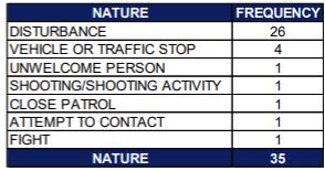 DuringthemonthofDecember2025,therewereatotalof17FPRAdetailsworked for the North 25th area from Avenue O to Avenue M. There were 35 calls for serviceduringthedetailtimes.Disturbanceswerethetopreasonsforthecalls.