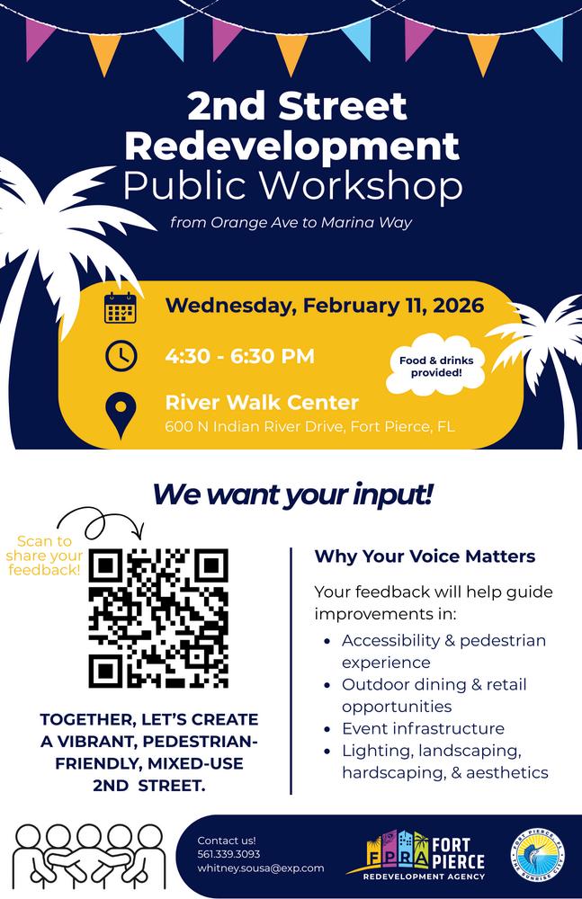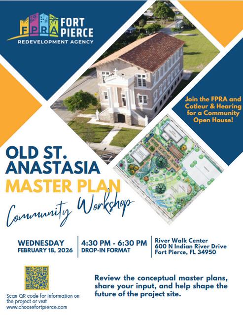 The Fort Pierce Redevelopment Agency will host the Old St. Anastasia Master Plan Workshop on Wednesday,February18,2026,from4:30pmto6:30pm attheRiverWalkCenter,locatedat600N.IndianRiverDrive.Theworkshop willbeheldinadrop-informat,allowingattendeestoparticipateatanytime duringtheevent.