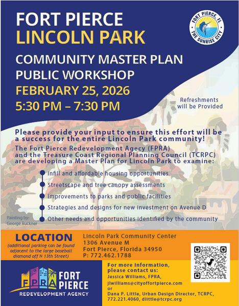 The first community workshop is scheduled for Wednesday, February 25, 2026, at 5:30 pm at the Lincoln Park Community Center located at 1306 AvenueMinFortPierce.The community workshops will provide residents and stakeholders the opportunity to share input and help shape the future of LincolnPark.