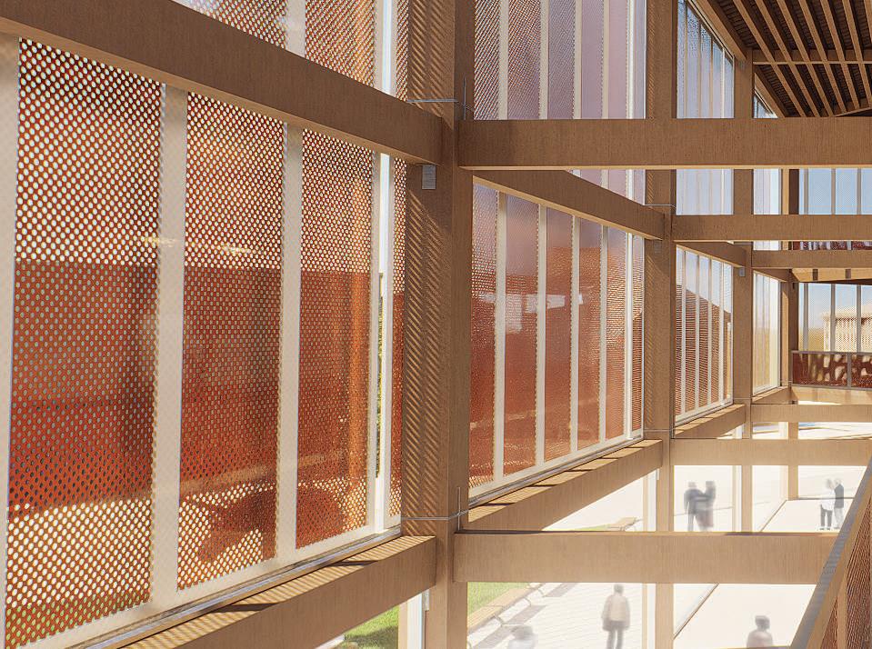 Openings carved to allow light and airflow. Views are framed toward river and landscape.
