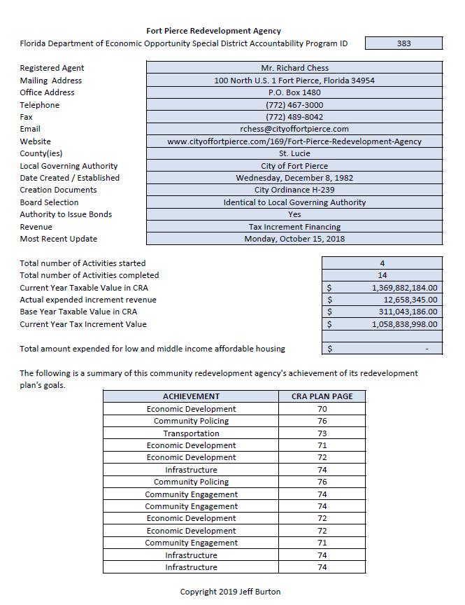 TheFortPierceRedevelopmentAgencyBoardconsistsoffive(5)memberswhoalsos as the Mayor and City Commission. The purpose of the Agency is to revitalize both onmentoftheredevelopmentarea.