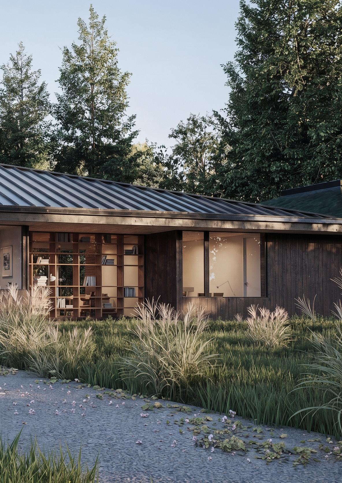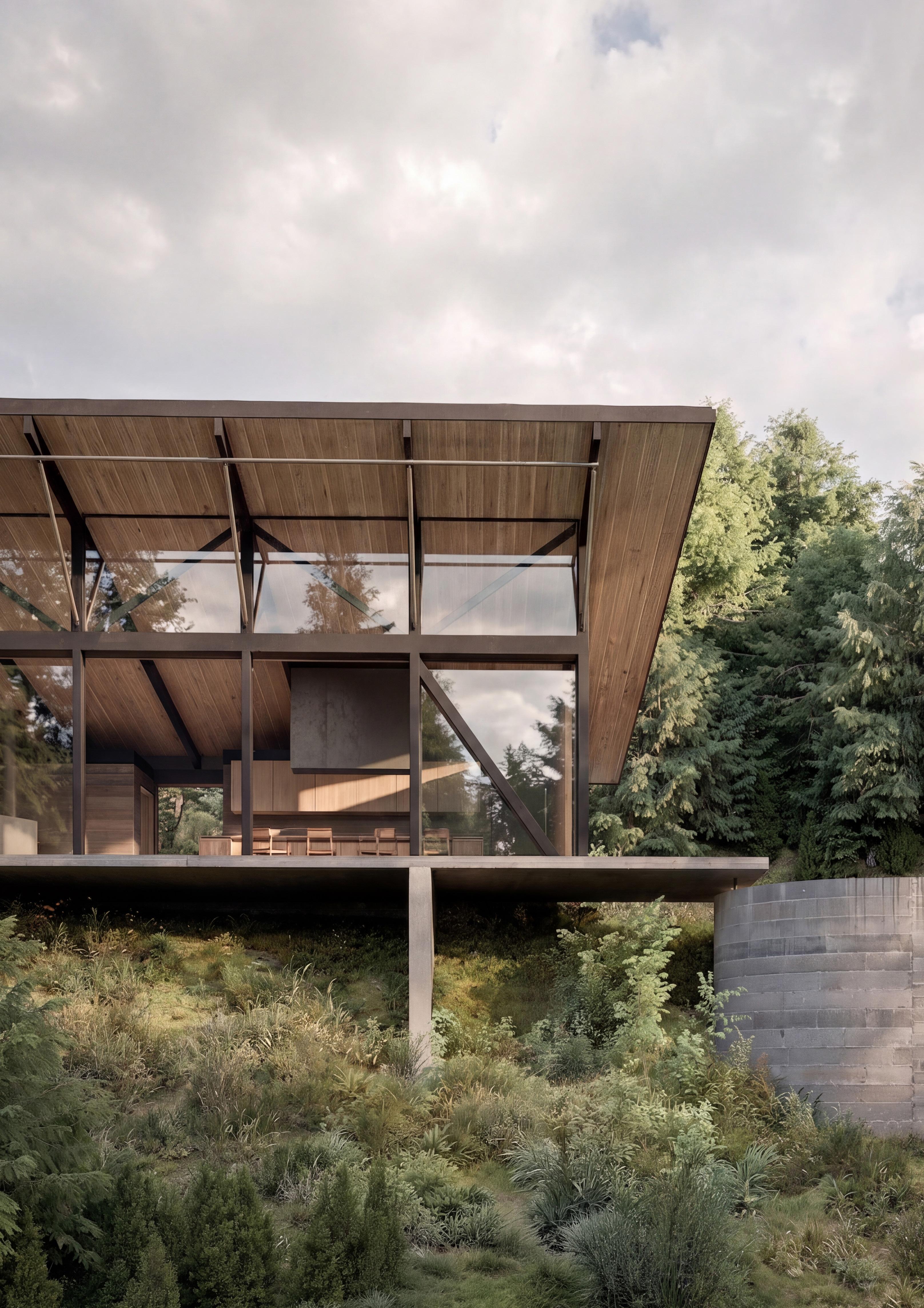 La casa se posa suavemente sobre el terreno en pendiente, elevándose mediante pilares que minimizan su impacto en el paisaje. Su estructura combina madera cálida y perfiles metálicos, generando una estética contemporánea y liviana. Grandes paños de vidrio abren el interior hacia el bosque, integrando vistas y luz natural. La cubierta inclinada acentúa su carácter acogedor, mientras el entorno vegetal envuelve la vivienda, creando una relación armónica entre arquitectura y naturaleza.