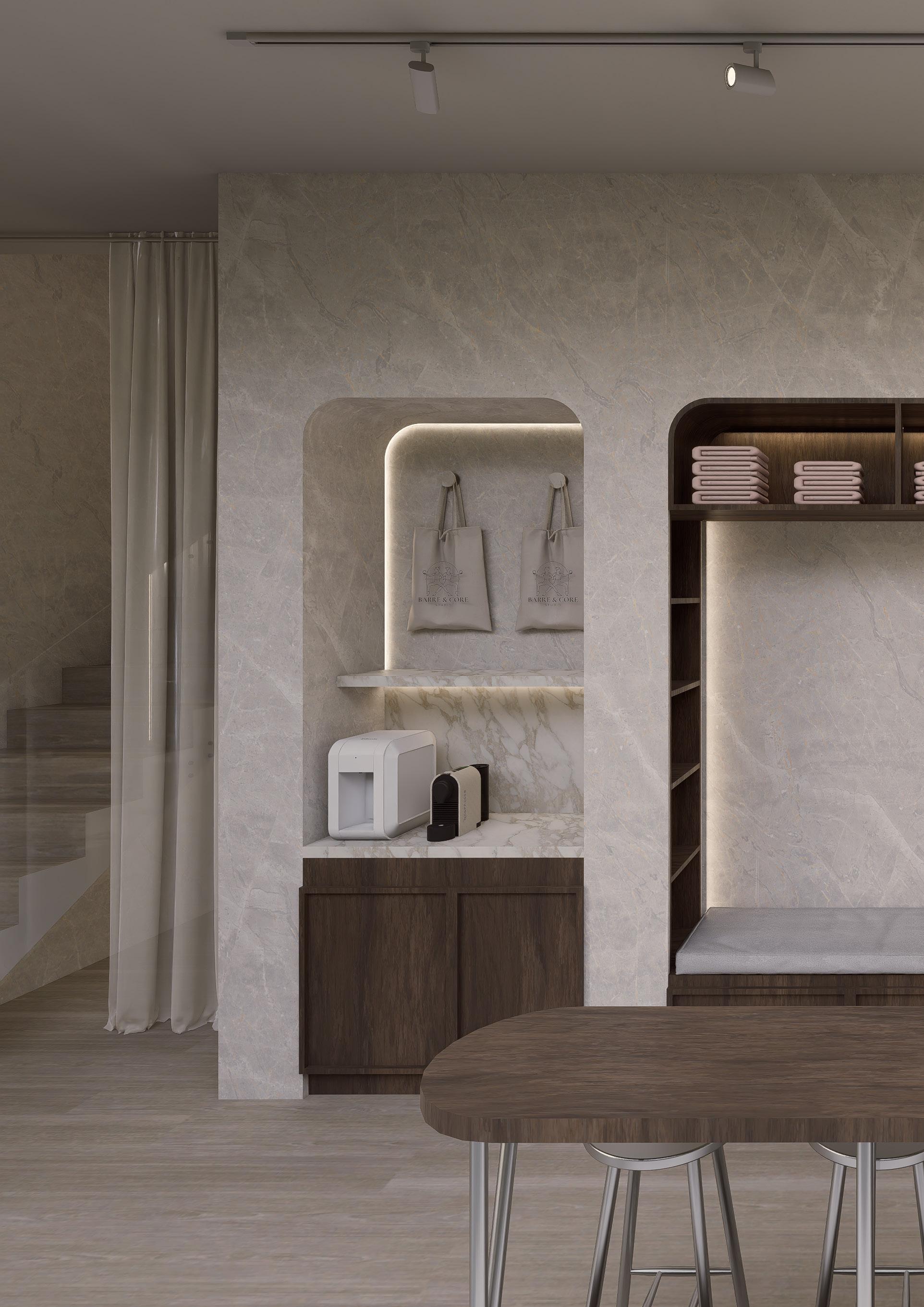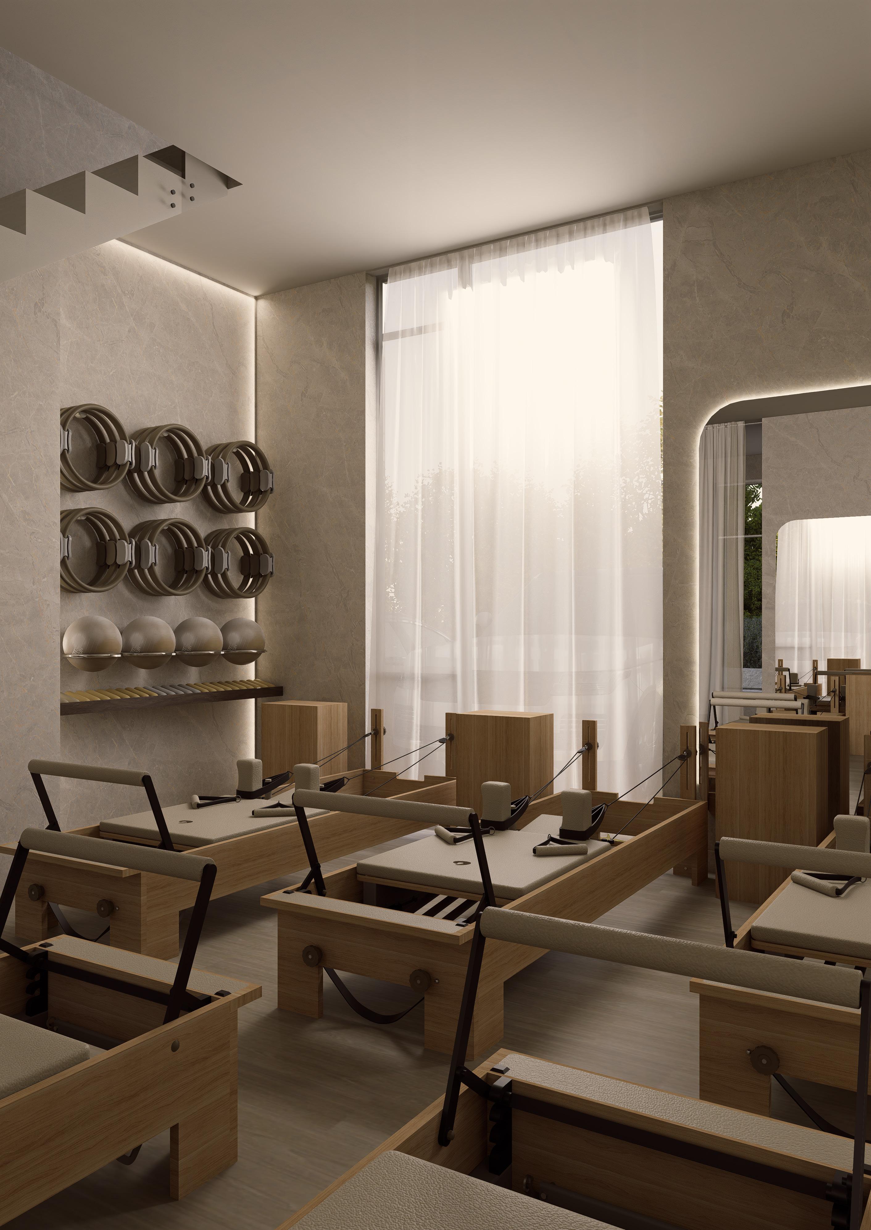 El proyecto corresponde a un estudio de pilates concebido como un espacio de bienestar y calma, donde la materialidad y la luz juegan un rol fundamental. Predominan tonos neutros, revestimientos continuos y madera natural, generando una atmósfera cálida y equilibrada. La disposición ordenada de las máquinas optimiza el uso del espacio, mientras los espejos amplifican la percepción y luminosidad. Elementos vegetales incorporan vida al ambiente, reforzando una experiencia sensorial enfocada en el cuerpo y la mente.