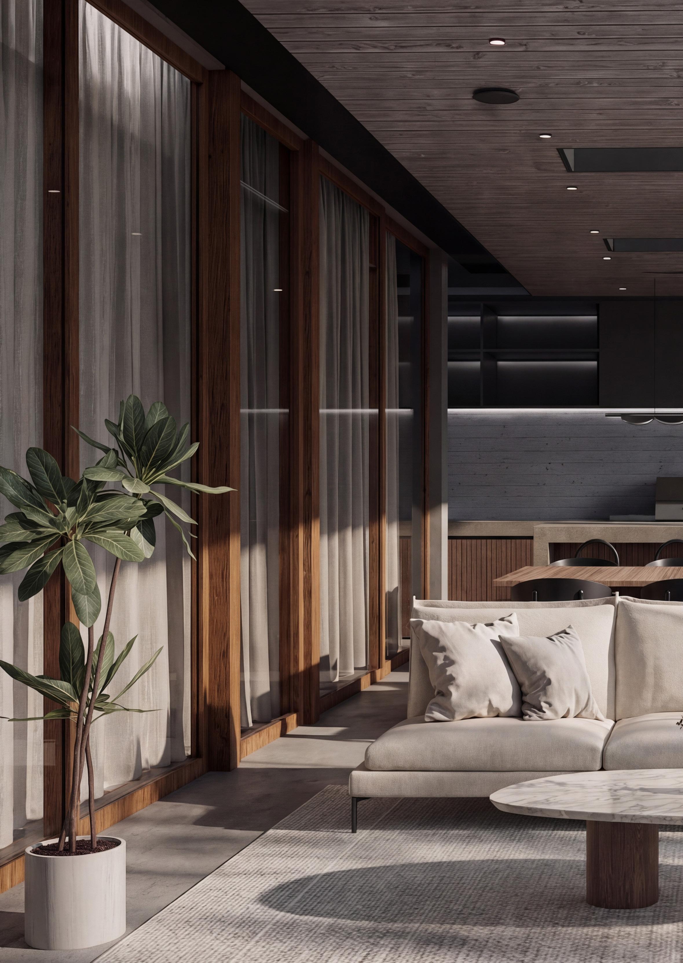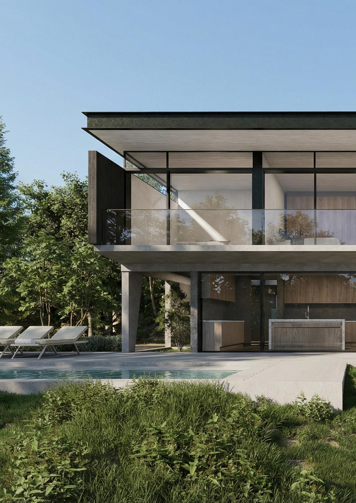 La vivienda presenta una estética contemporánea de líneas limpias y horizontales, combinando hormigón visto, madera natural y amplias superficies acristaladas. En el primer nivel, la integración interior-exterior se potencia con una terraza continua y una cocina abierta hacia el jardín. El segundo nivel alberga espacios más privados, protegidos por un voladizo liviano y barandas de vidrio. La vegetación circundante suaviza la materialidad, generando un ambiente equilibrado, luminoso y acogedor, destacando la relación directa con el paisaje natural.