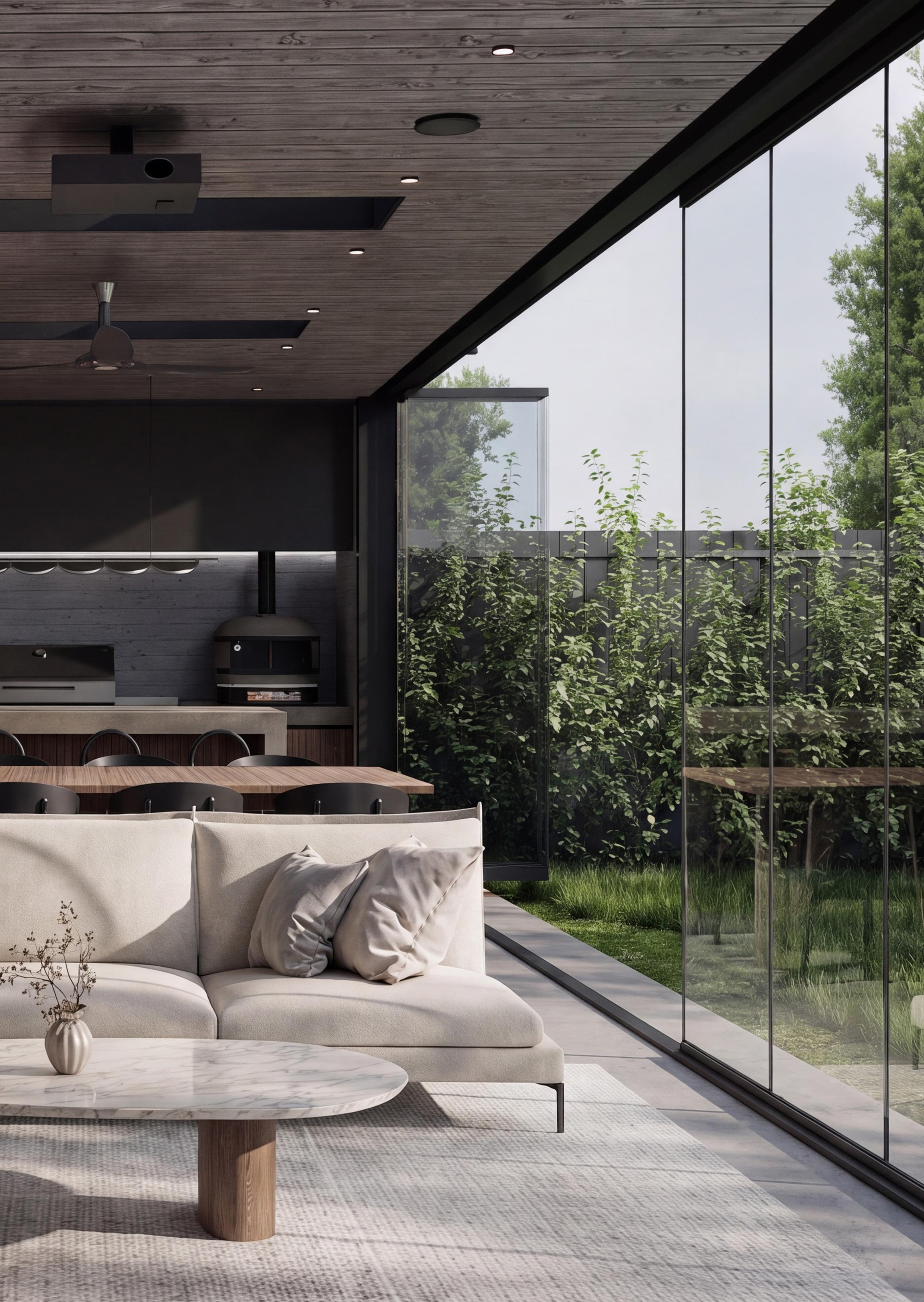 Remodelación de quincho que redefine el espacio exterior como una extensión habitable de alto estándar. La propuesta integra cocina, comedor y estar bajo una envolvente continua, potenciando la relación con el jardín mediante cierres vidriados. La materialidad combina madera, piedra y superficies oscuras, aportando sobriedad y calidez. El mobiliario fijo y la iluminación técnica estructuran el uso, generando un ambiente versátil, confortable y adecuado tanto para reuniones sociales como para el uso cotidiano.
