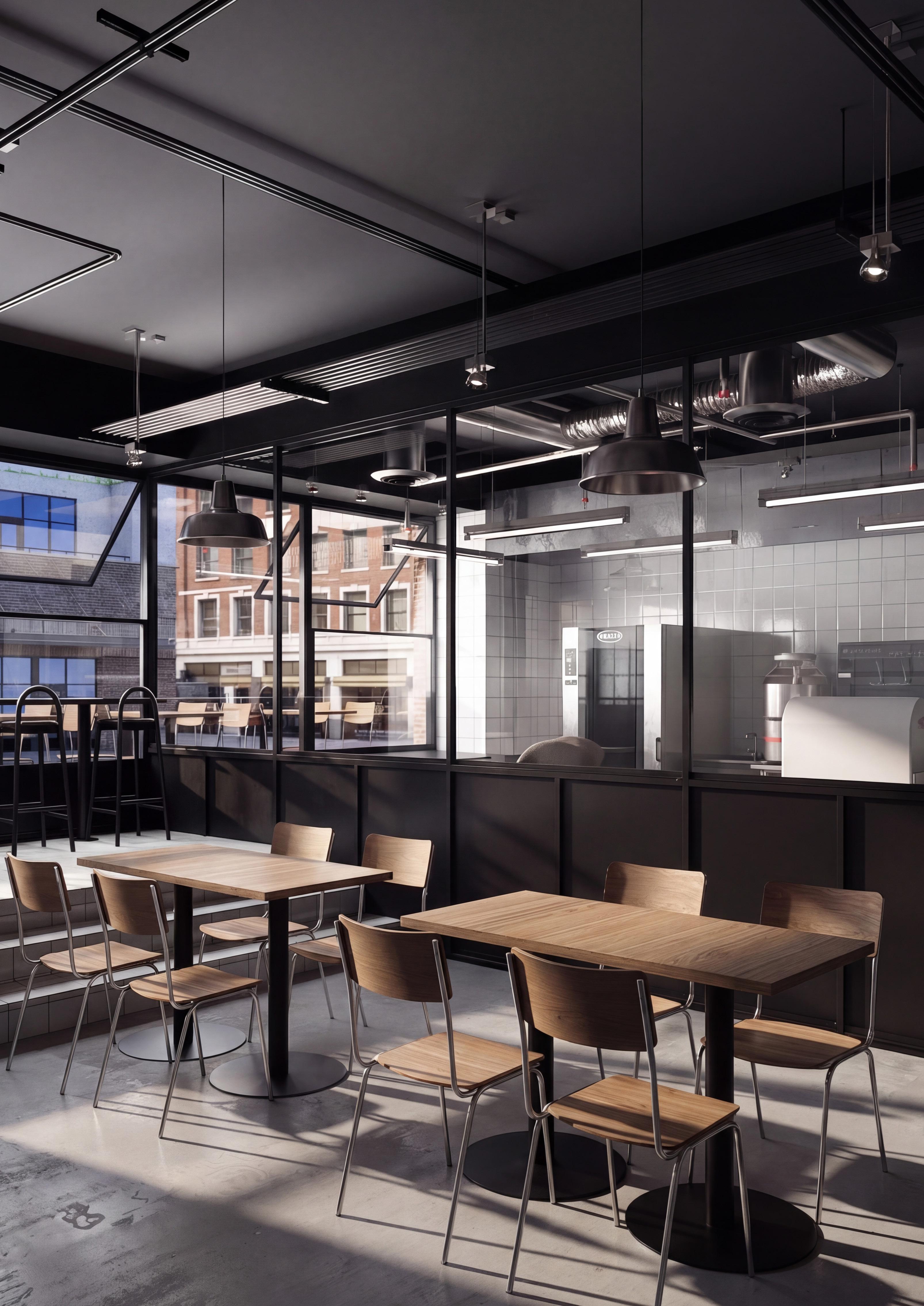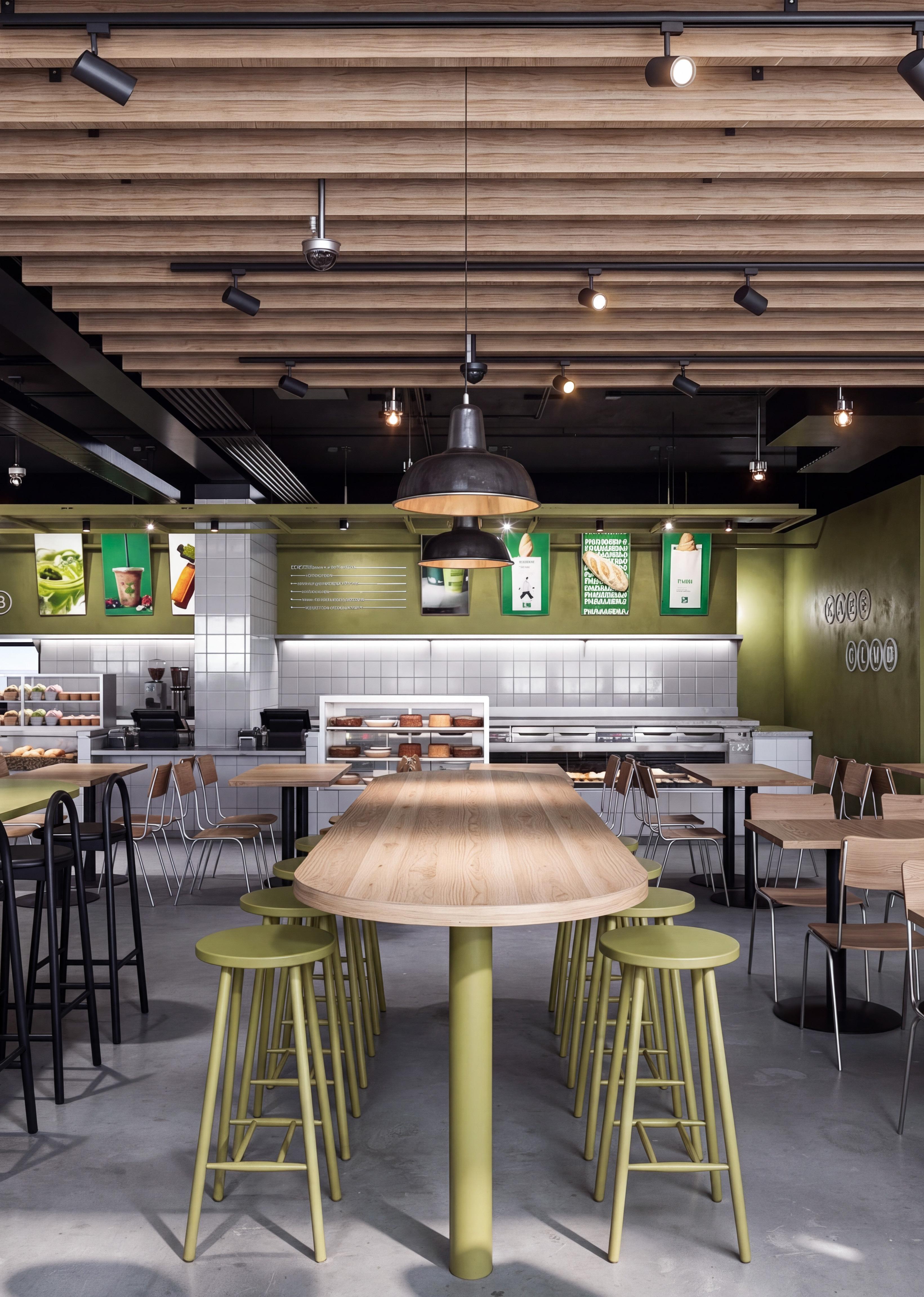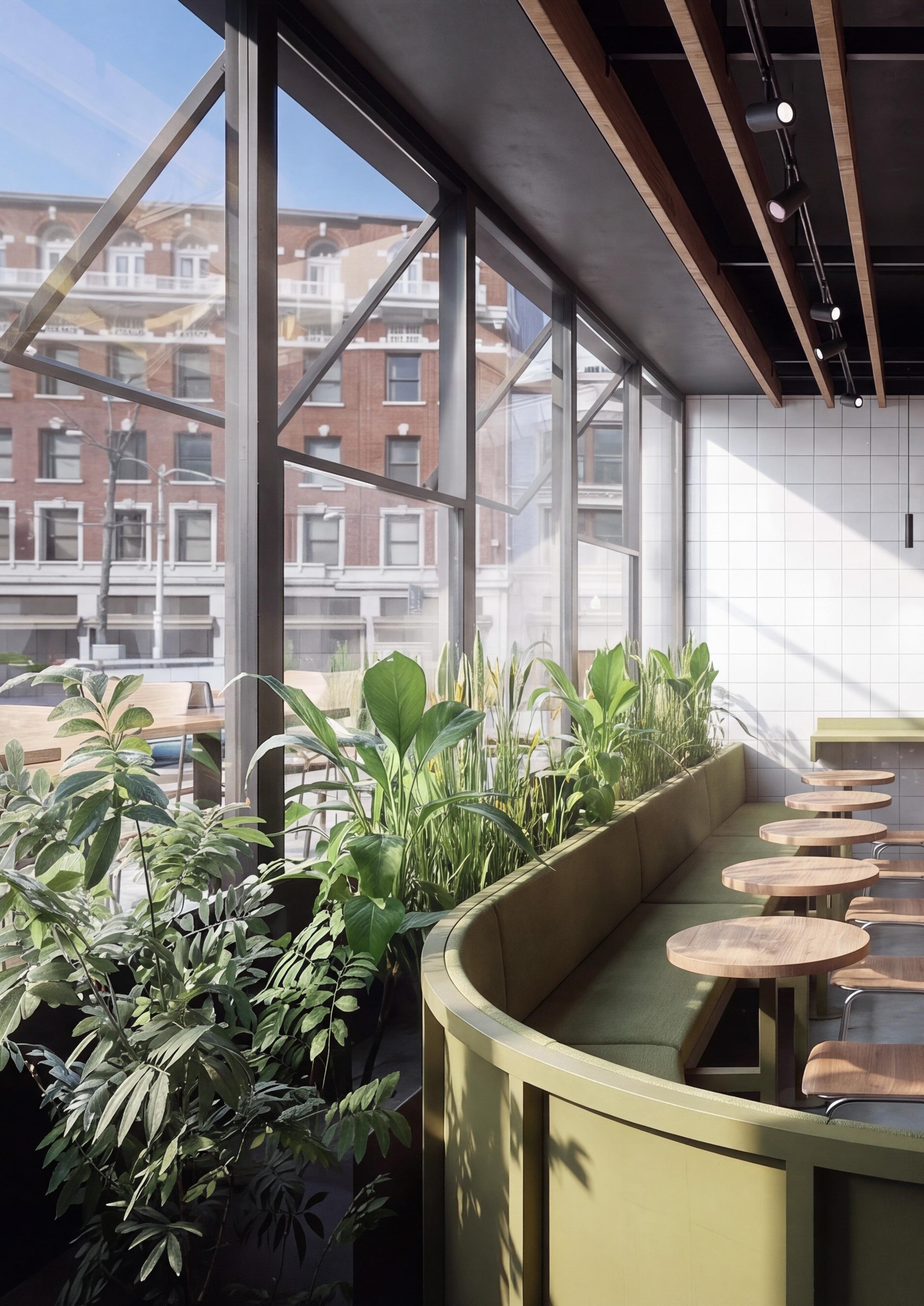 Espacio gastronómico de carácter contemporáneo que integra diseño funcional y una cuidada materialidad. La propuesta se organiza en torno a una barra curva con vegetación incorporada, generando un límite suave entre áreas de circulación y permanencia. La envolvente vidriada potencia la iluminación natural y la relación con el entorno urbano. Elementos de madera, acero y cerámica configuran una atmósfera equilibrada, mientras el cielo de listones con iluminación técnica aporta orden, ritmo y profundidad espacial.