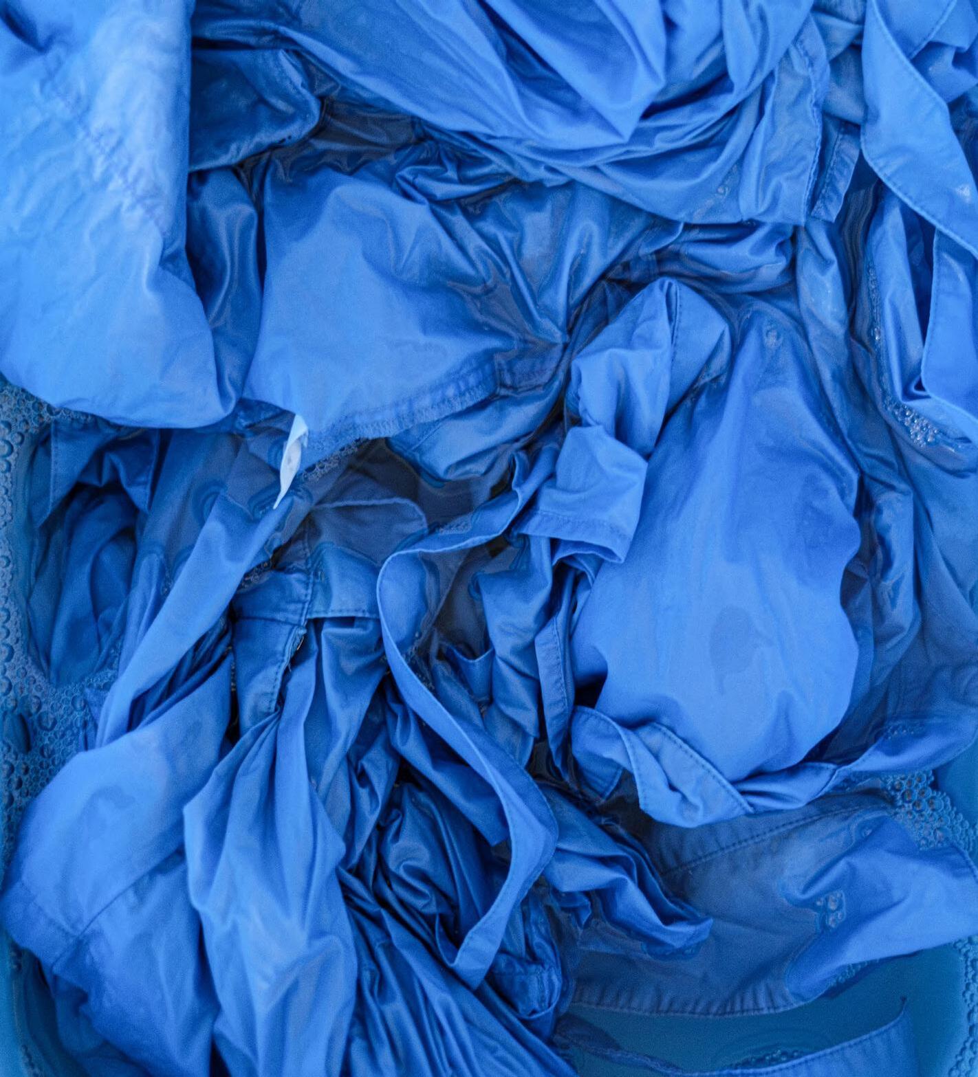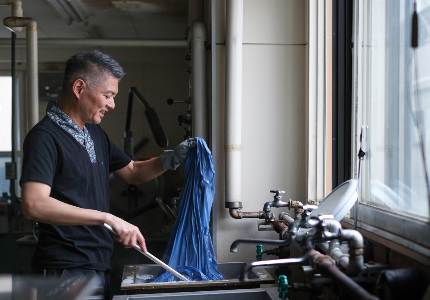 着物の需要は下降の一途を辿っていますが、野口さんは、さまざまな方法 で着物の文化を現代の暮らしに取り込もうと挑戦しています。そのひとつが天 然染料を使った染色です。天然染料は、環境負荷が少なく、自然な色合い が特徴。合成染料に比べ染まり具合が浅いため、制服についた汗や汚れを 覆い隠すには不十分です。また、 SHIROの制服の生地にはポリエステルが 含まれていて、天然染料が浸透しづらい。自然素材を使い切るというSHIRO の考えに共感してくださった野口さんは、難しいことを承知で天然染料での 染色にチャレンジしてくださいました。