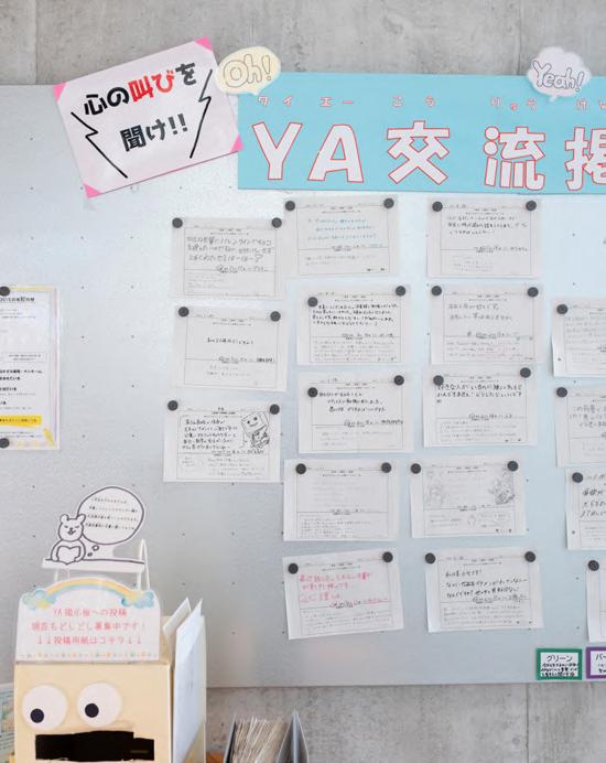 2 階の図書館エリアを歩いていると、小さな白い紙が何枚も貼られている 掲示板に遭遇しました。「心の叫びを聞け!YA 交流掲示板」と書かれたその 掲示板は、子どもたちと図書館の司書を繋ぐ交流の場です。大人になりつつ ある13 歳から19 歳までの“ヤングアダルト(YA)世代”と呼ばれる中高生が 日々の悩みをカードに書いてポストすると、必ず司書が返事を書いて、掲示 板に貼り回答をしてくれます。友達に裏切られたこと、将来の進路で悩んで いること、好きな人に想いを伝えられないこと……。そうした子どもたちの等 身大の悩みと、それに丁寧に答える司書の温かいやり取りを見て、SHIRO PAPER編集部のメンバーの表情から自然に笑顔がこぼれます。「YA 交流掲示 板」は、居場所が単純な空間だけではなく、人と人の心が通いあうことでつく られる「関係のかたち」であることを教えてくれます。YA 交流掲示板について、 メディコスの総合プロデューサーを務めた吉成信夫さんが教えてくれました。 「グリーンさんという仮名でウィットに富んだ回答をしていた司書さんが産休 に入った時期がありました。すると、グリーンさんロスです、という投書が子 どもたちから30 通くらい来た。その反応を見て、子どもたちの心の居場所に なっていることを実感しました」