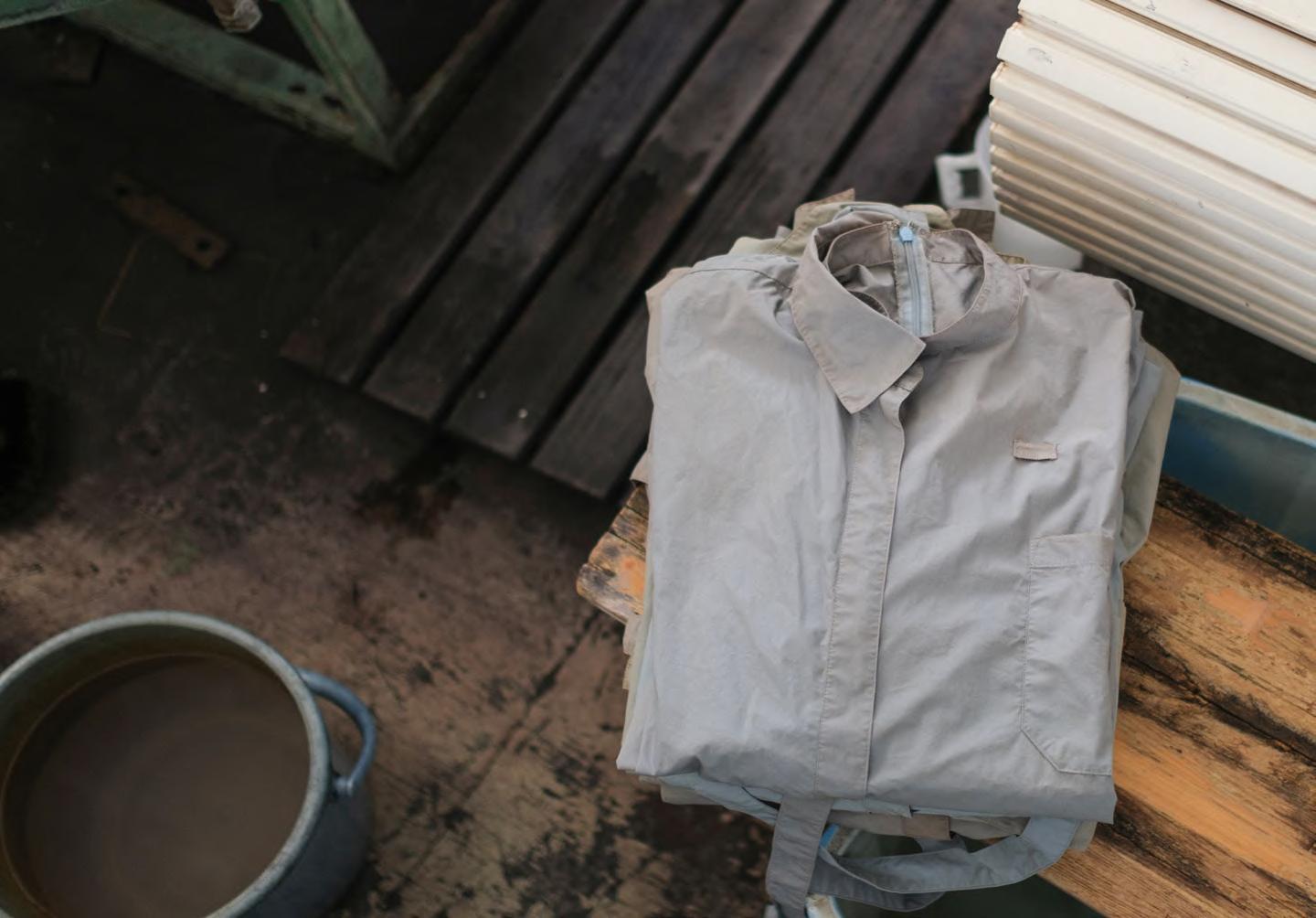 2025年6月にオープンした渋谷PARCO店でスタッフが着用している制服は、 全国の直営店舗で着用している制服を天然染色したもの。 3月にオープンし たミナモア広島店で採用した藍染めの制服に続いて、今回染めをお願いした のは、札幌で悉 しっ 皆 かい 屋 や を営む野口染舗。悉皆屋とは、着物のお直しに関する 相談を受ける相談窓口のこと。日本には古くから着物を染め直して着続ける 文化がありました。