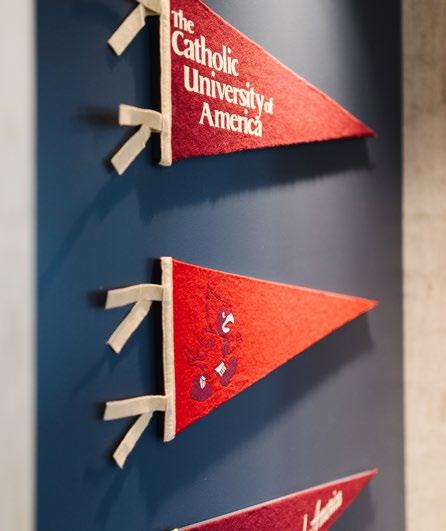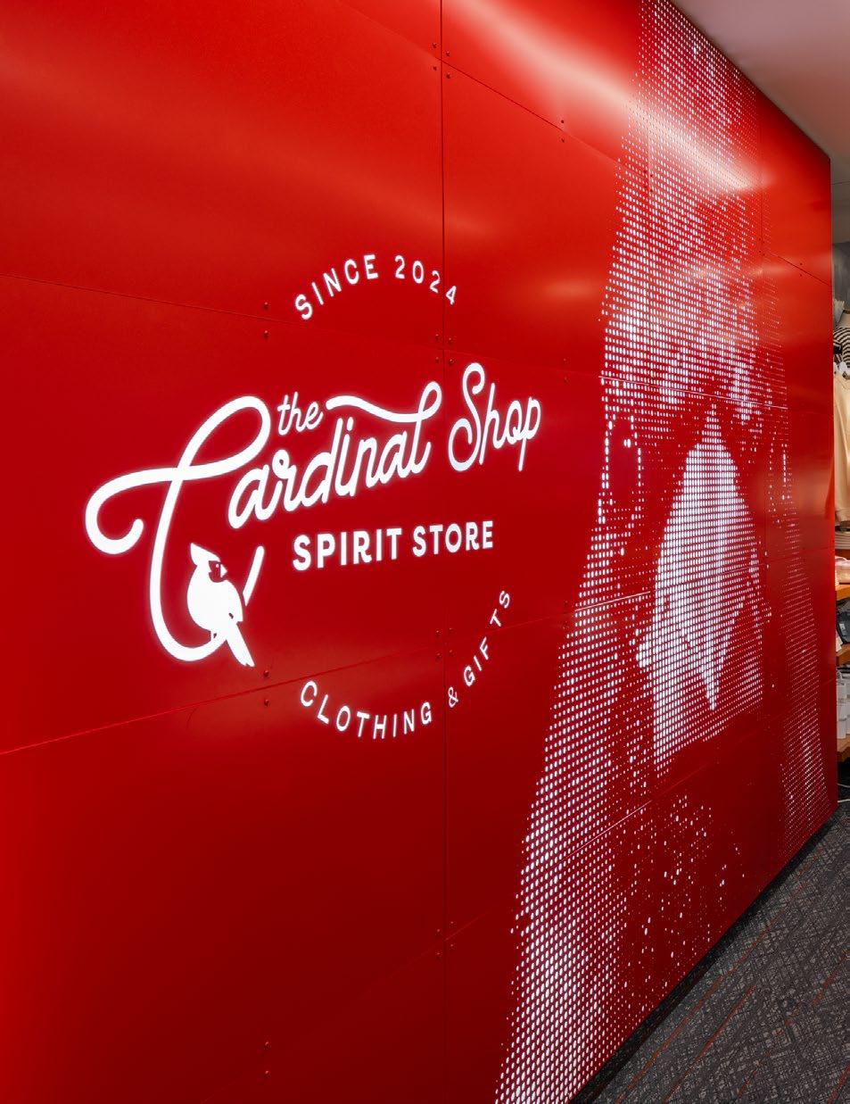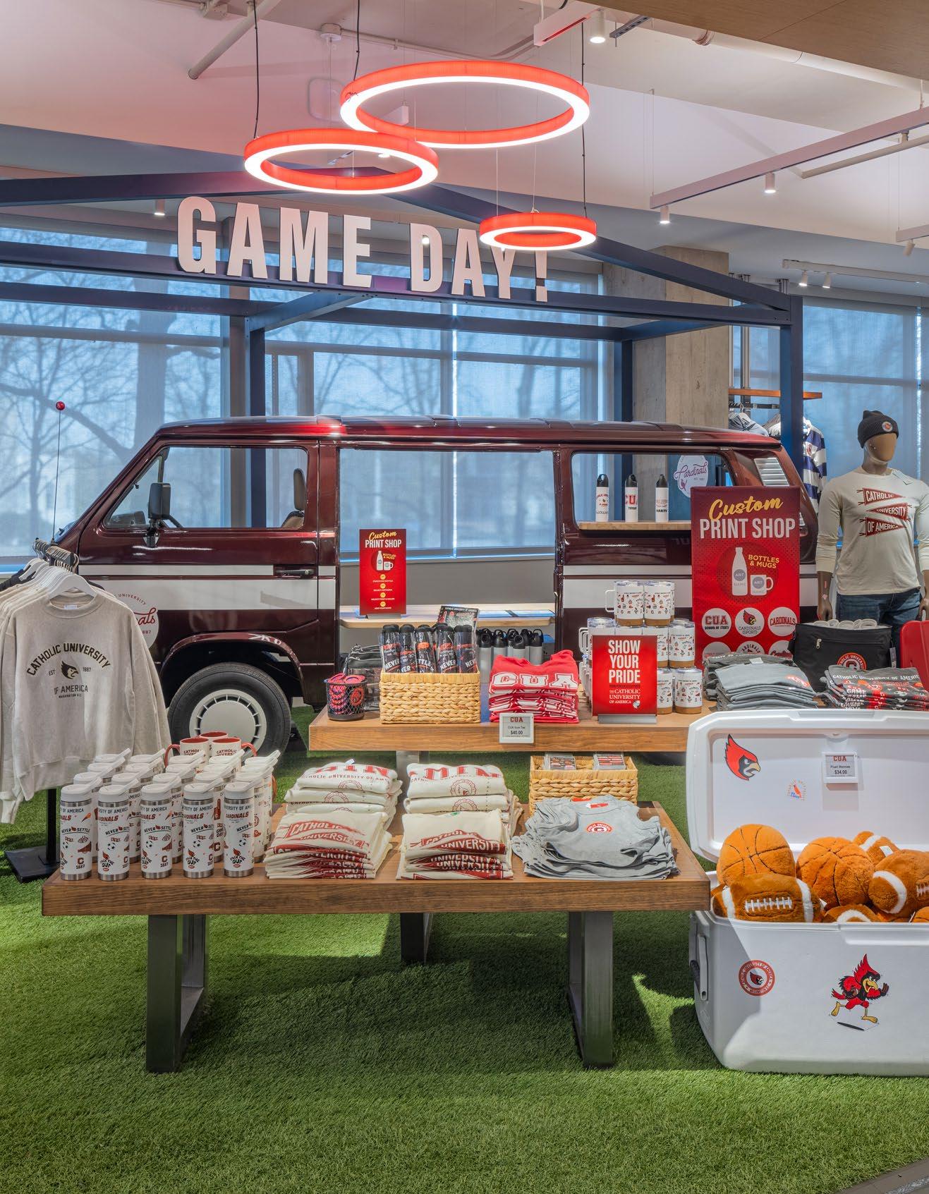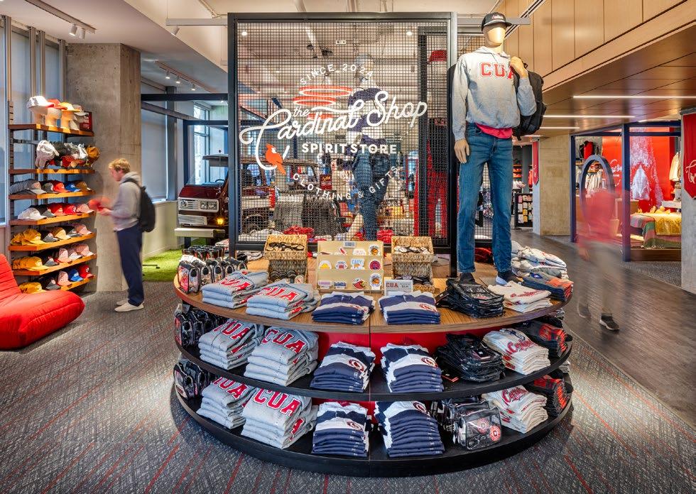 A bold cardinal graphic behind the Cardinal Shop’s cash wrap commands attention, reinforcing school pride at first glance. Vibrant school colors, thematic displays, archival photos and memorabilia transform the shop into a tribute to Catholic University’s legacy, creating an emotional connection for students, alumni, and visitors alike.