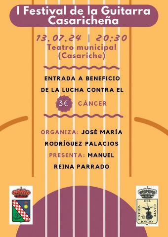 20.30.- I Festival de la Guitarra de Casariche. Lugar: Teatro Municipal. Las entradas son a beneficio de la Junta Local de la AECC, pueden adquirirse previamente a través de la asociación, o ese mismo día en la taquilla.