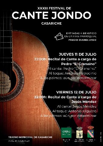 Un año más, el Teatro Municipal acoge una nueva edición del Festival de Cante Jondo; como es habitual este Festival es organizado por el Excmo. Ayuntamiento de Casariche en colaboración con la Tertulia del Cante Jondo de Casariche. En esta ocasión, las entradas serán a beneficio de Cáritas Parroquial, y podrán adquirirse contactando con la Asociación, previamente, o en el Teatro Municipal, los días de las actuaciones.