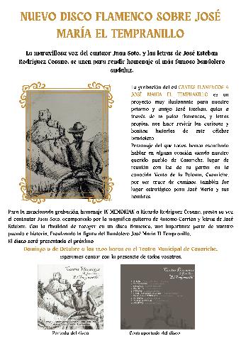 Los bandoleros han recibido en el mundo del flamenco diversos homenajes en forma de colección de cantes, como el que Manuel Orta dedicó a Diego Corrientes en 1988 o, ahora, el disco que comentamos aquí, entre otros. En nuestro caso, José Esteban Rodríguez Cosano y su recordado hermano Ricardo ya escribieron además el libro Semblanza flamenca de José María “El Tempranillo”. Ahora el primero ve realizado uno de sus sueños, una antología de cantes glosando la trayectoria de este “Robin Hood” andaluz, como ha sido llamado. Ha escrito las letras de todos los cantes, con el pertinente perfecto ajuste métrico y expresivo. La primera letra de las alegrías ya resume la vida de este cordobés de Jauja: “La historia de un bandolero / que nació en Andalucía, / una mano traicionera / fue y le arrebató la vía”. Y en todas podemos ver un aire panegírico, resaltando cualidades como la valentía y sucesos que han ido marcando su vida amorosa, personal y su impacto social: “Soy Tempranillo de Jauja, / Rey de la Sierra Morena. / Mi fama, a los cuatro vientos, / por toa España resuena”.