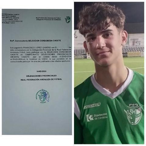 A Francisco López Gamero por su participación en la Copa de Andalucía de selecciones cadete de fútbol celebrada en Cádiz en el mes de febrero