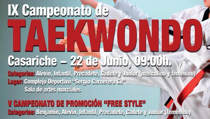 9:00.- IX Campeonato de Taekwondo “Ciudad de Ventippo” 2024. Este campeonato que ya alcanza su novena edición está organizado por el Club Taekwondo Casariche en colaboración con el Excmo. Ayuntamiento de Casariche. De igual modo, este año, se celebra el V Campeonato Free Style, modalidad acrobática dentro de la disciplina del Taekwondo. En ellos, participarán los niñ@s que forman parte de este Club local en sus diferentes categorías, sirviendo éste como clausura del curso 2023/2024. Lugar: Sala de artes marciales del Complejo Deportivo “Sergio Carnerero Gil”.