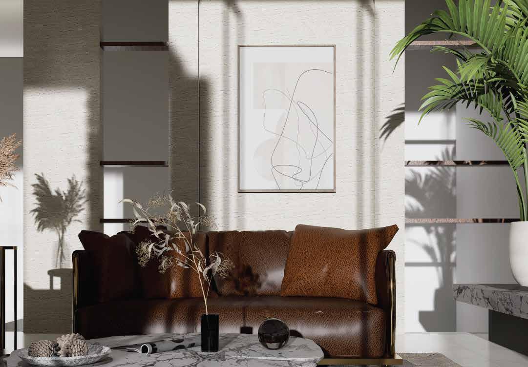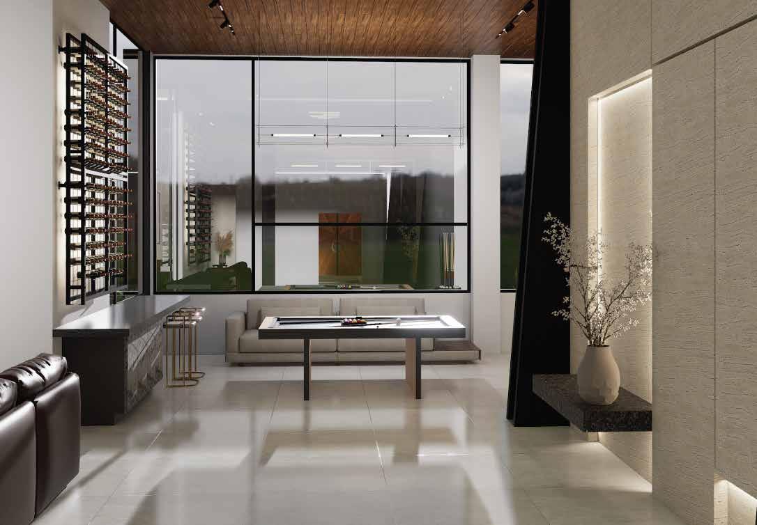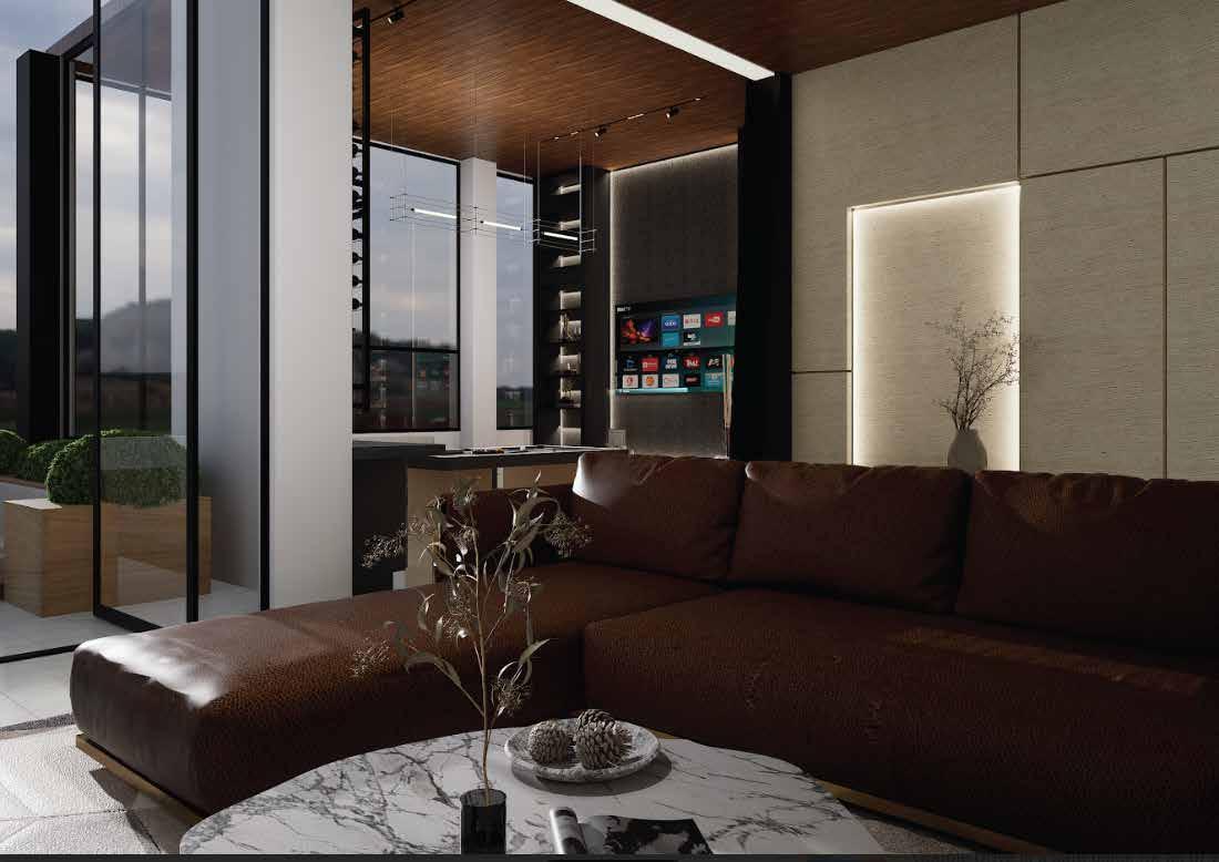 This project creates an executive modern residence intended for sophisticated urban living, with a seamless and luxurious blend of high-end materials. The central design strategy is based on deliberate material contrast: expansive, glossy white marble flooring creates a cool, minimalist foundation that is immediately balanced and warmed by a commanding dark wood ceiling (likely Walnut or Wenge) installed across the primary living spaces to define volume and enhance acoustic intimacy. The living area is anchored by sturdy, dark brown leather seating and a recessed modern fireplace, which serves as a focal point for long-term comfort.