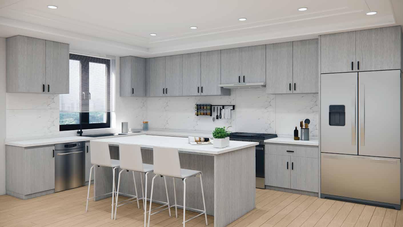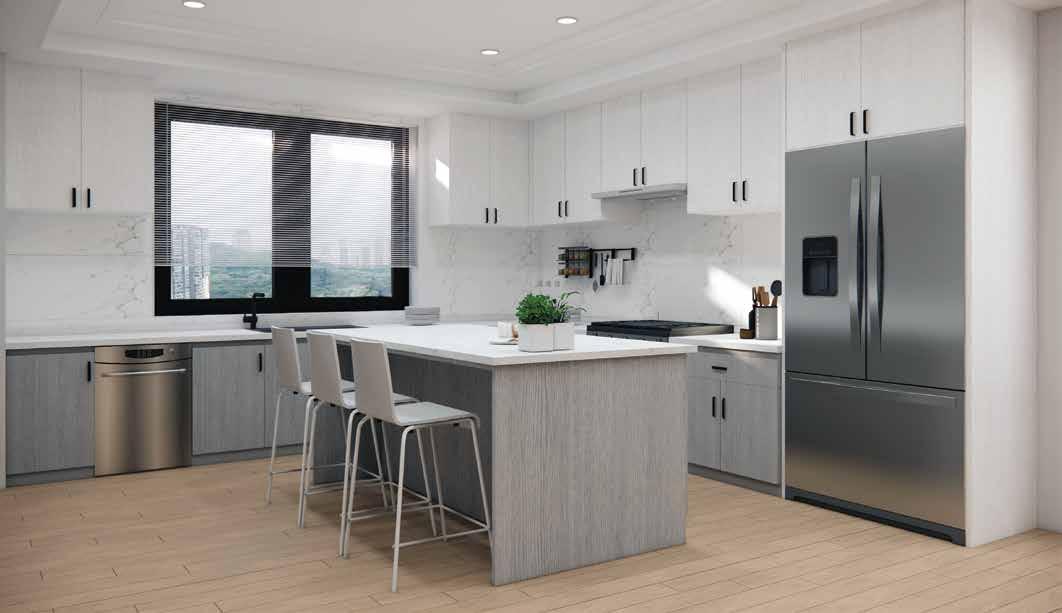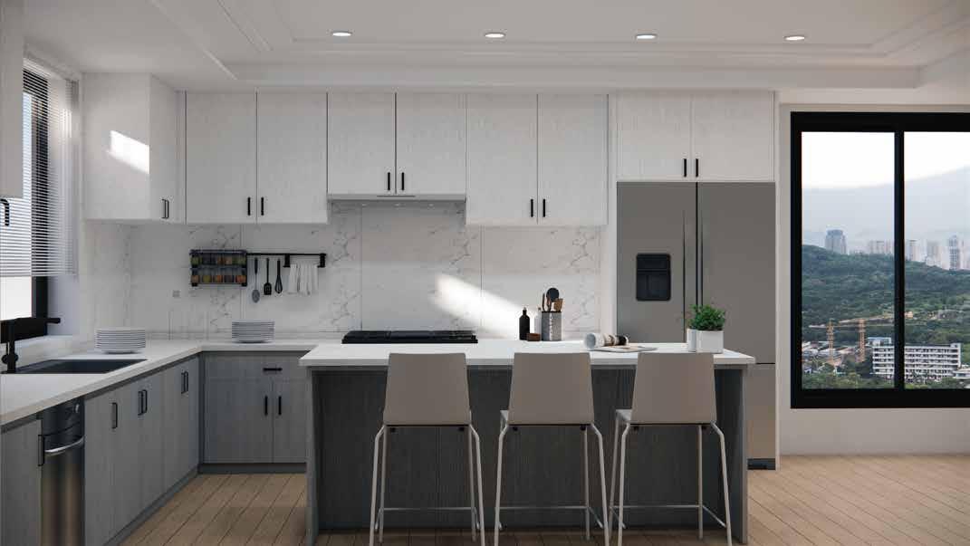 This project delivers a refined, modern kitchen concept for a U.S.-based client developing 17 unique kitchen layouts, each with its own material palette and design character. This particular scheme focuses on a bright, contemporary aesthetic, using a balanced combination of matte white upper cabinets, textured grey lower cabinets, and clean marble-patterned surfaces. The layout is built around a functional central island, designed to support both prep work and casual dining. Large windows bring in natural light, amplifying the clean lines and neutral tones, while the black hardware and fixtures add crisp contrast. Integrated stainless-steel appliances complete the space, keeping the look consistent and uncluttered.