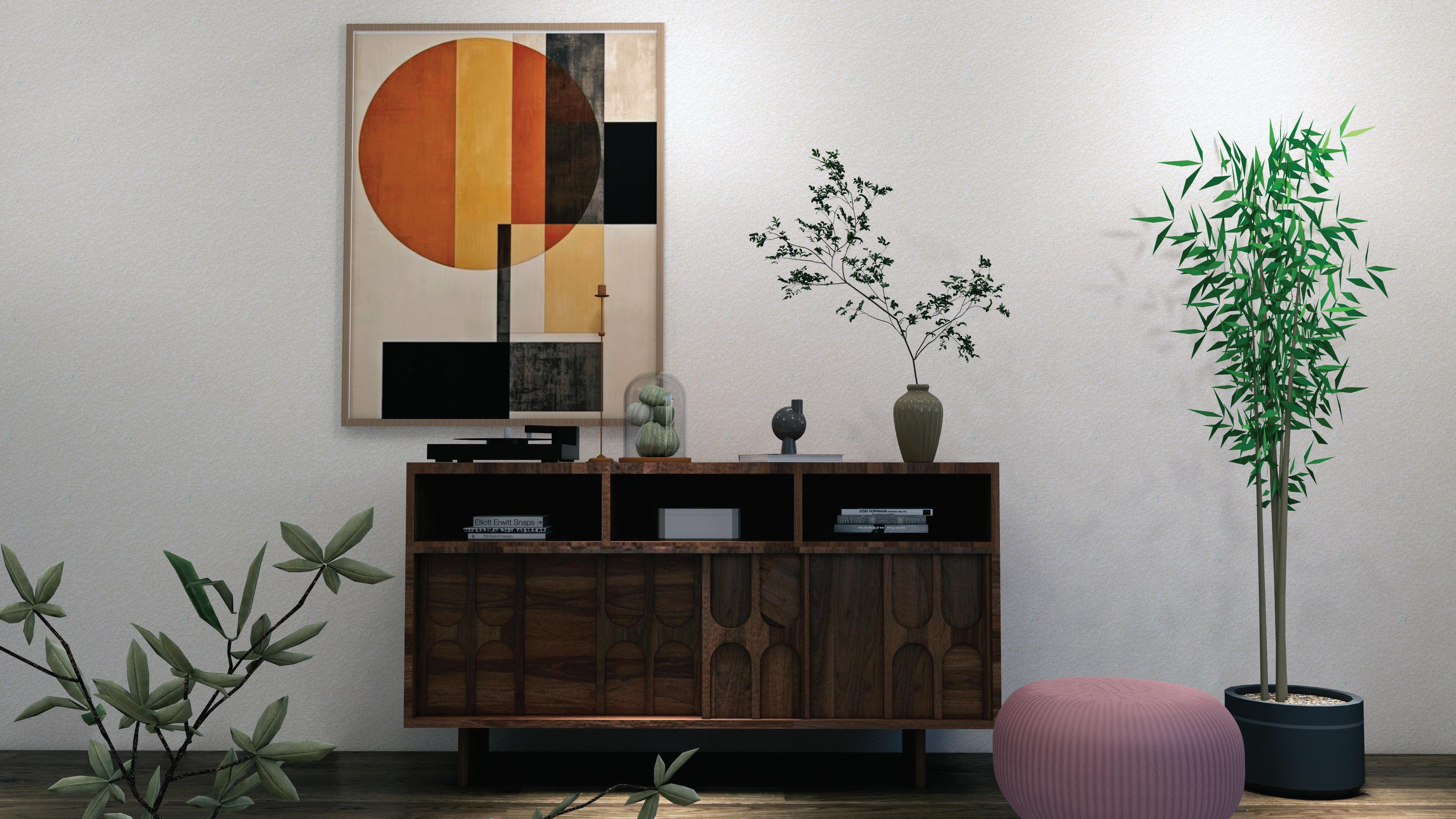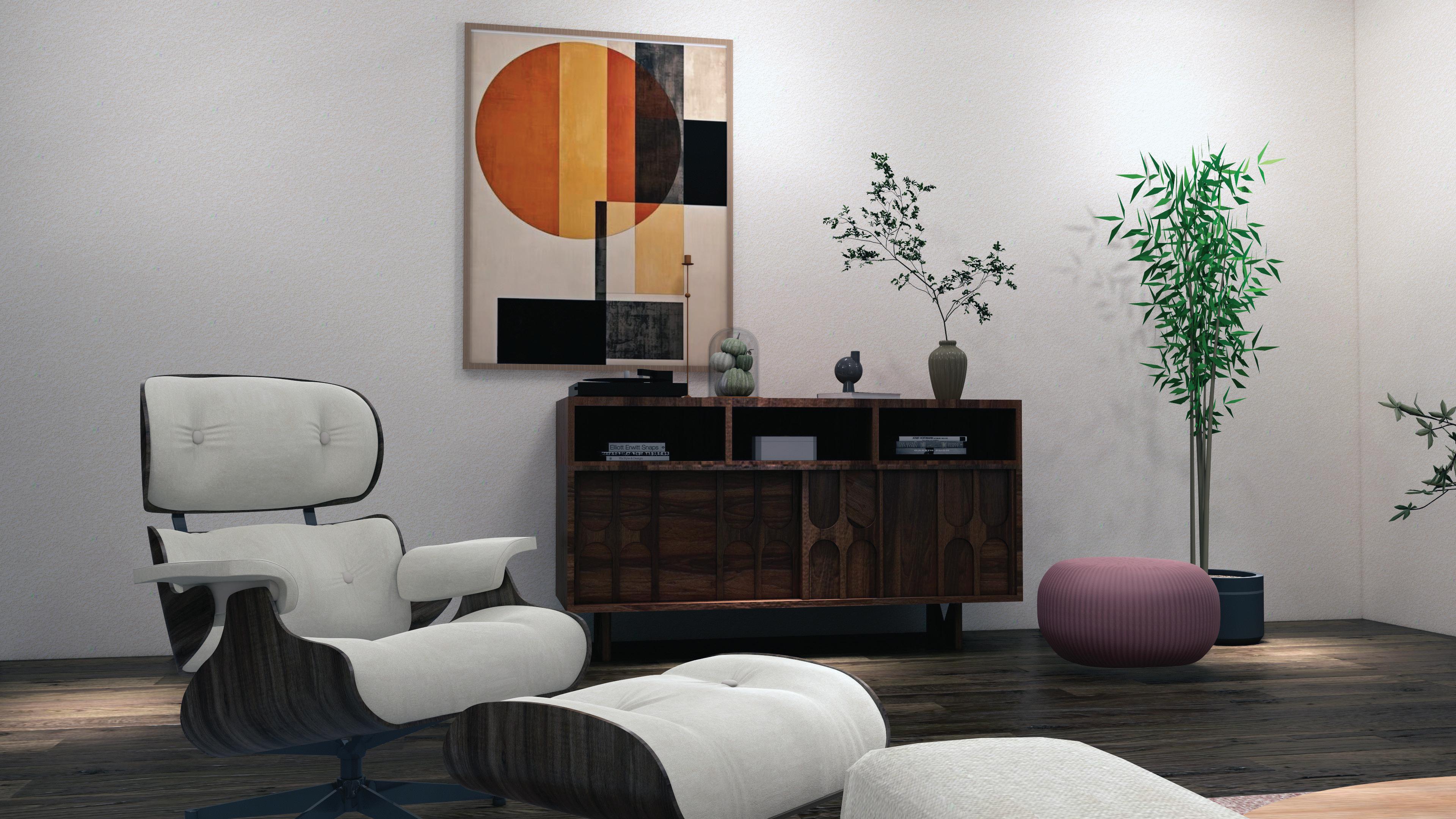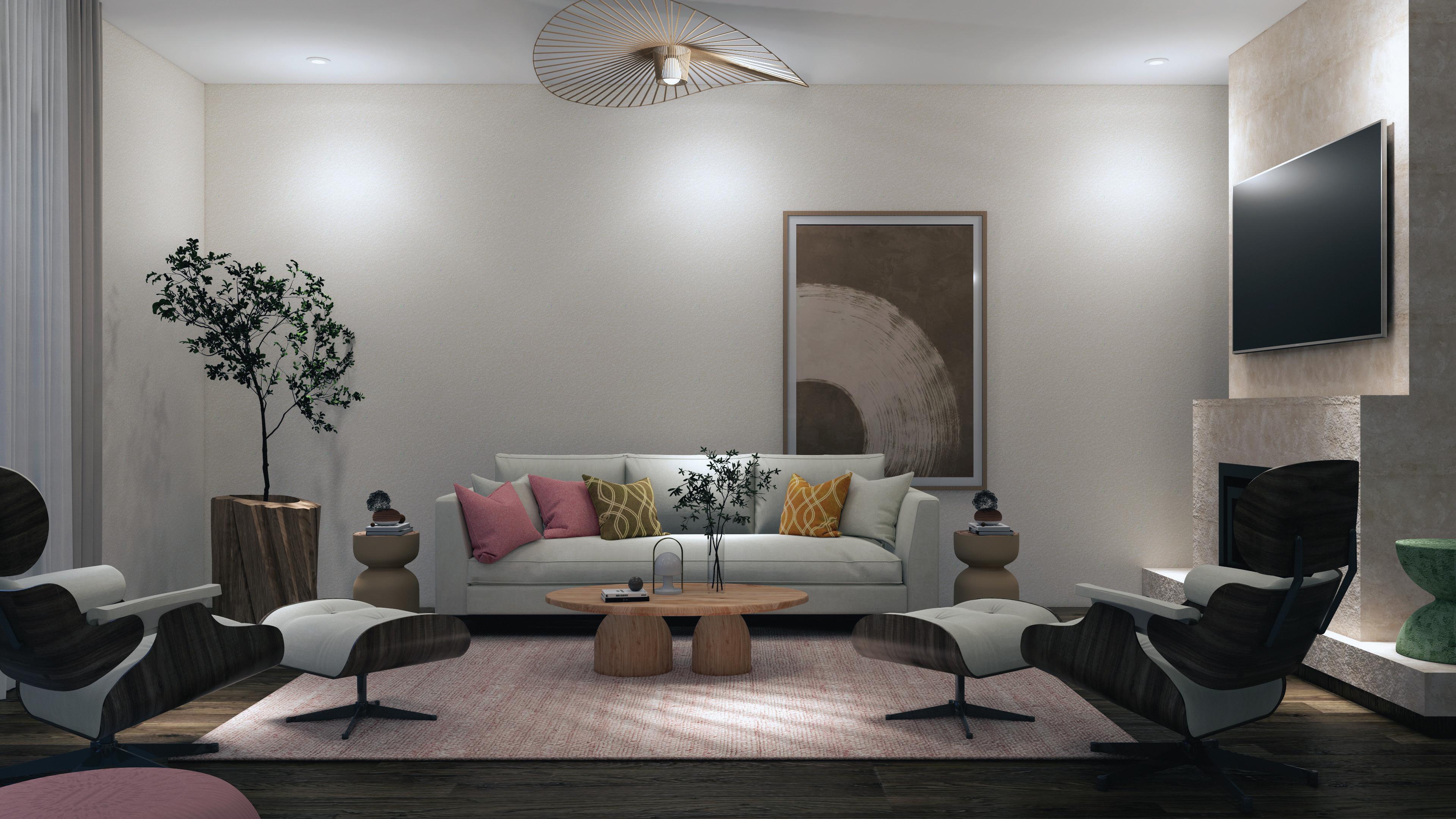 This project addressed the interior design of a high-end Airbnb lounge, balancing the need for exceptional guest experience with the operational requirement for durability and low maintenance. The conceptual framework utilizes a sophisticated blend of Mid-Century Modern form and Contemporary Minimalism. We used a neutral foundation punctuated by calculated accents (burnt orange, terracotta artwork) to achieve a timeless, universally appealing aesthetic. The layout prioritizes dual functionality: maximized social seating with the large sofa, complemented by a dedicated, iconic reading/retreat area featuring a signature lounge chair. This strategy ensures broad guest appeal, crucial for maximizing occupancy rates.