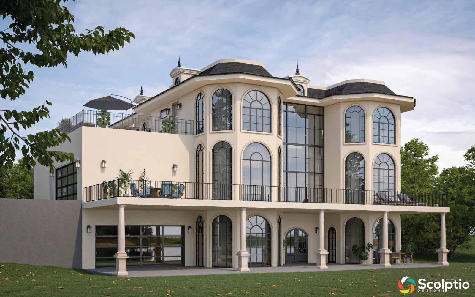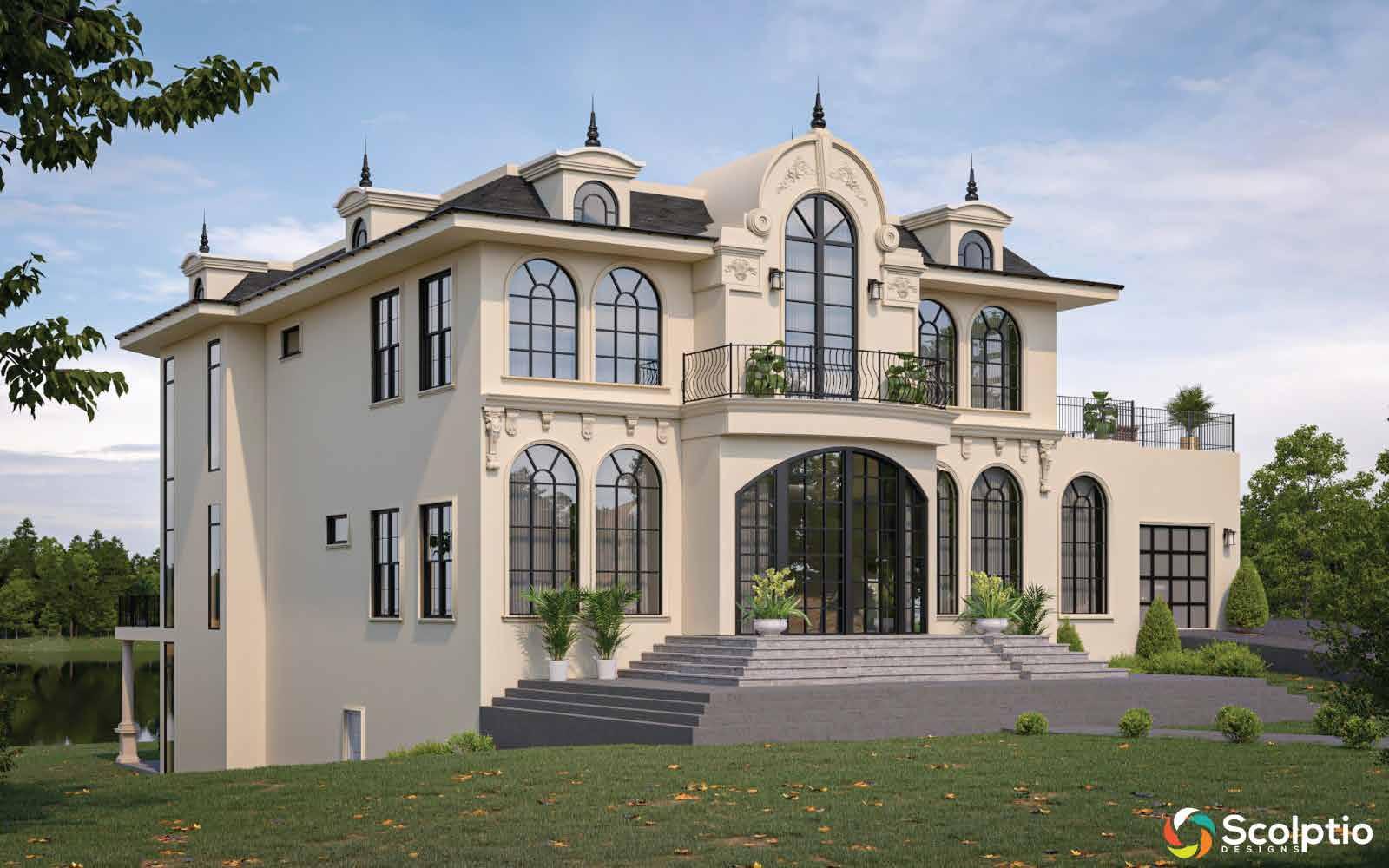 Developed as a collaborative venture with Architect Kevin (Scolptio Design), this project involves the architectural and interior design of a prestigious neoclassical manor located in the USA. The exterior architecture pays homage to classical French aesthetics, featuring a grand symmetrical facade, a dark mansard roof with ornate dormer windows, and a dramatic arched loggia that defines the main entrance. The design prioritizes a sense of timeless elegance, utilizing a refined stone palette and intricate mouldings to establish a commanding presence within its context.