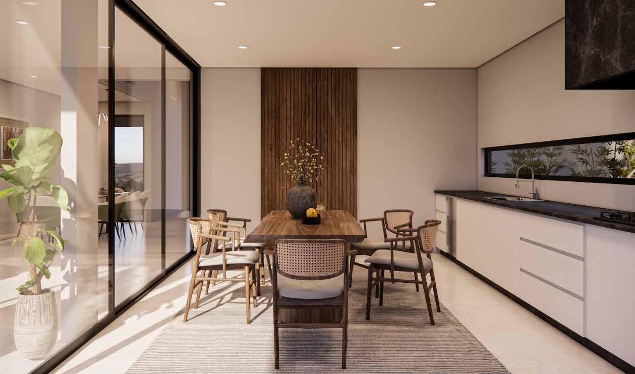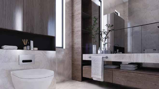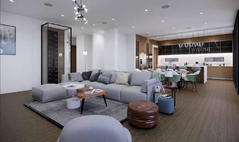 A professional-grade kitchen with a waterfall-edge island and integrated dark-wood cabinetry flows effortlessly into an elegant dining space. The master suite and bathroom further the luxurious material narrative, utilizing large format stone tiling and a freestanding soaking tub to create a serene, spa-like atmosphere.