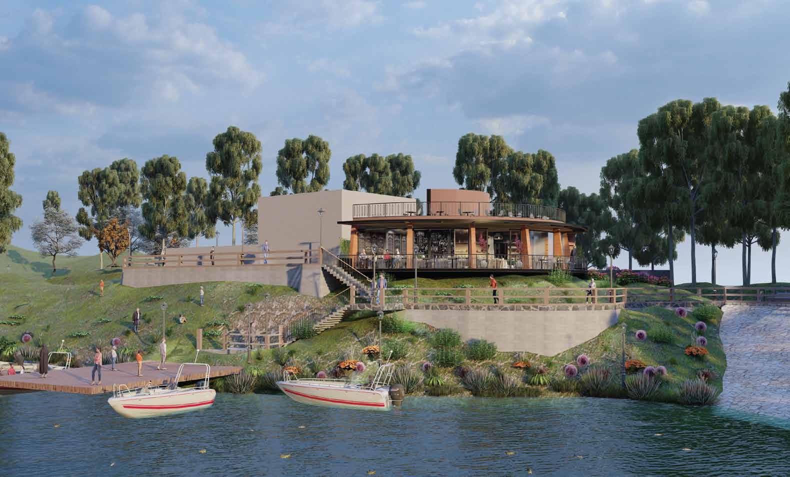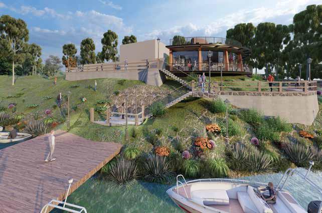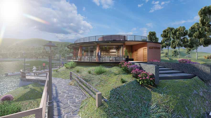 A key feature is the wraparound observation deck, which serves as a seamless transitional zone between the indoor dining area and the outdoors, encouraging guest interaction with the environment. The site planning further activates the waterfront through a cascading stone staircase that leads down to a lower promenade and boat docking area, effectively linking the architectural experience with recreational water activities.Situated on a scenic waterfront in Pakistan, this resort project centers on a distinctive, circular architectural pavilion designed to offer an immersive connection with the natural landscape