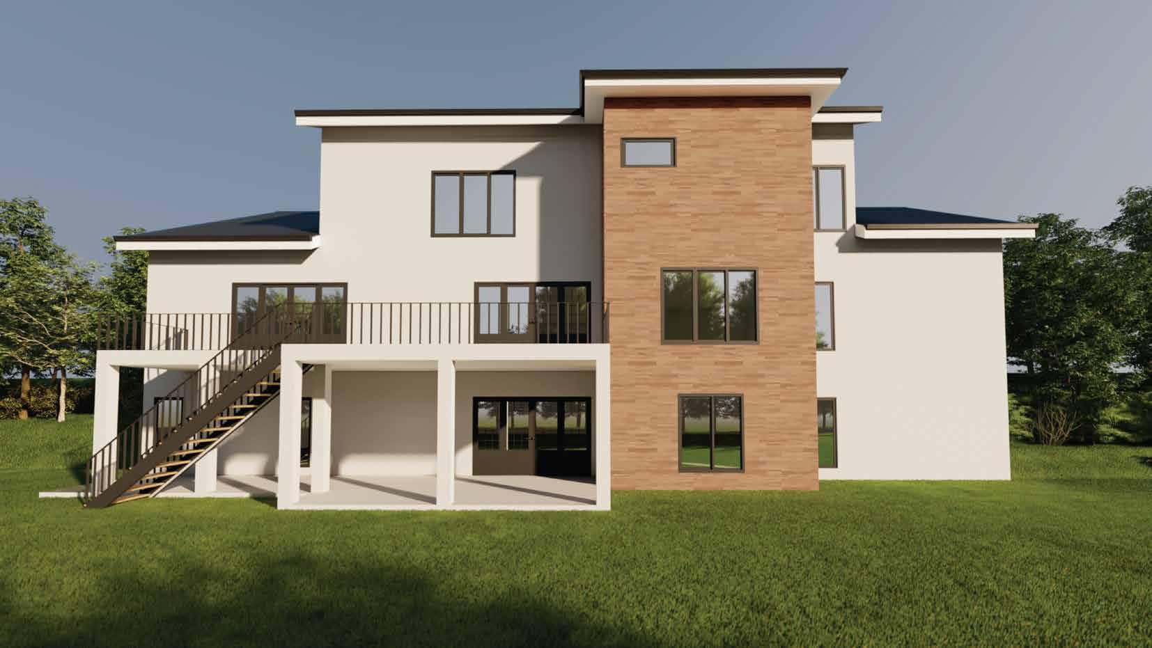 A key element of the design is the sophisticated material palette, which relies on a high-contrast strategy: crisp, white stucco surfaces serve as the primary canvas, offset by warm, textural accents of horizontal wood cladding and sharp, black window frames that add definition and depth. The home is designed for both curb appeal and outdoor living, featuring a prominent, integrated multi-car garage with dark sectional doors and a spacious rear terrace with a balcony that extends the living space outdoors. This project stands as a cohesive example of modern American residential architecture, prioritizing durability, aesthetic balance, and a strong connection to its site.