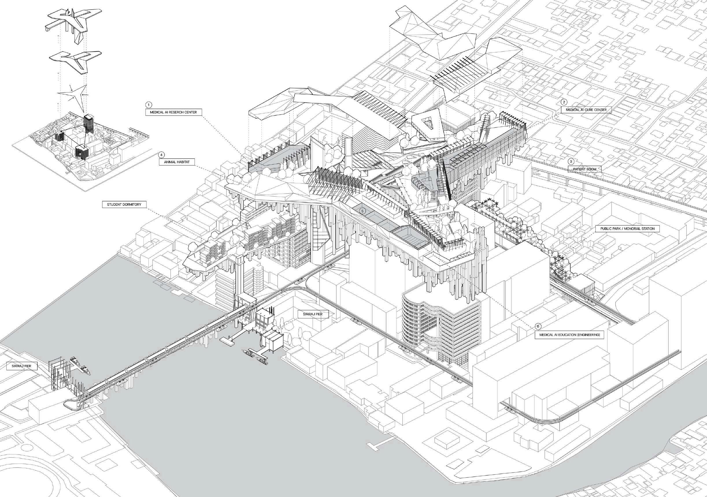 This type of parasite can live independently, yet once it attaches to a host, it begins to draw in the host’s resources. In the same way, Project White Line is an architectural system able to sustain itself, while also taking in patients from the existing Siriraj Hospital to reduce the issues caused by its current capacity.