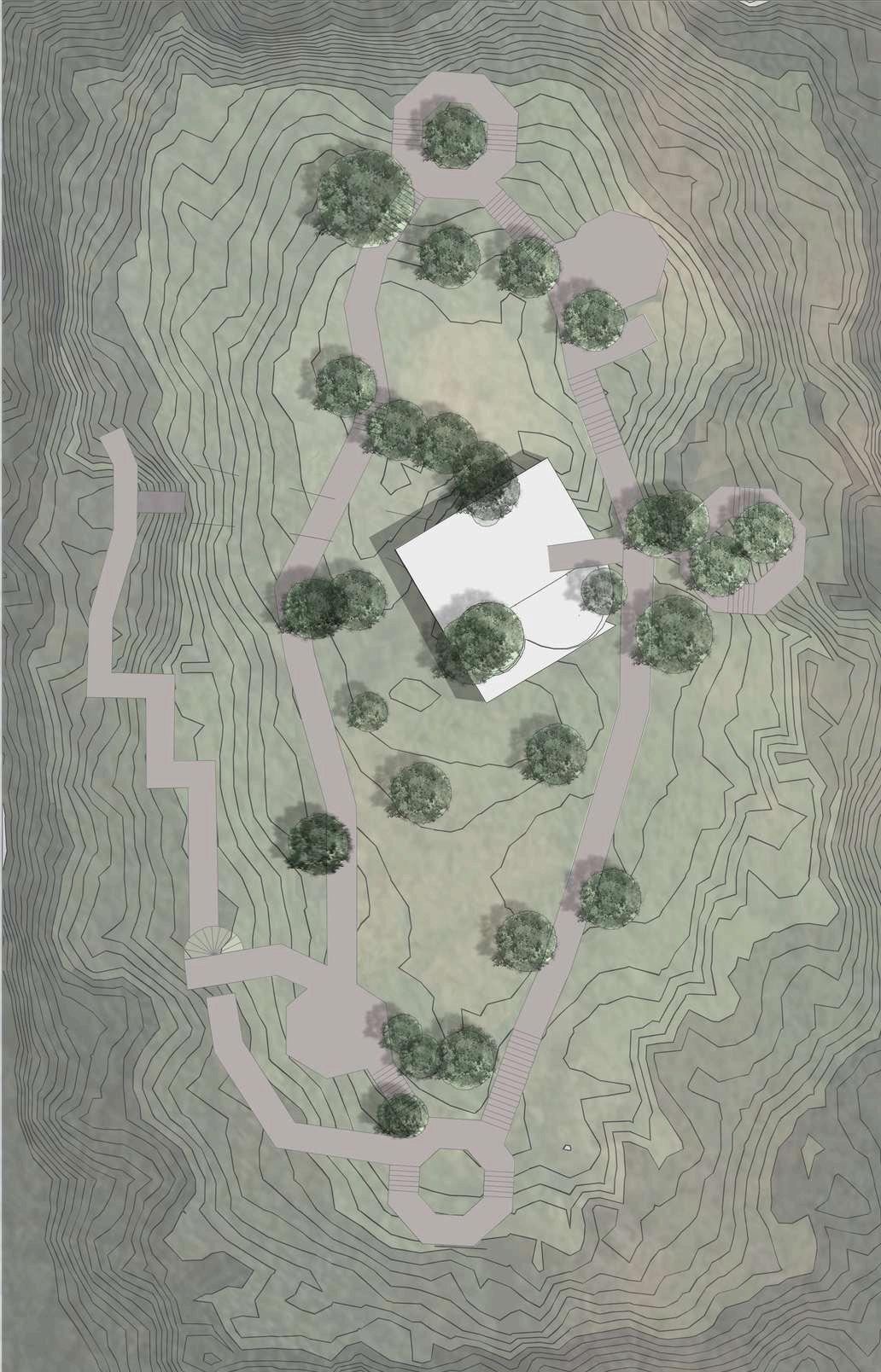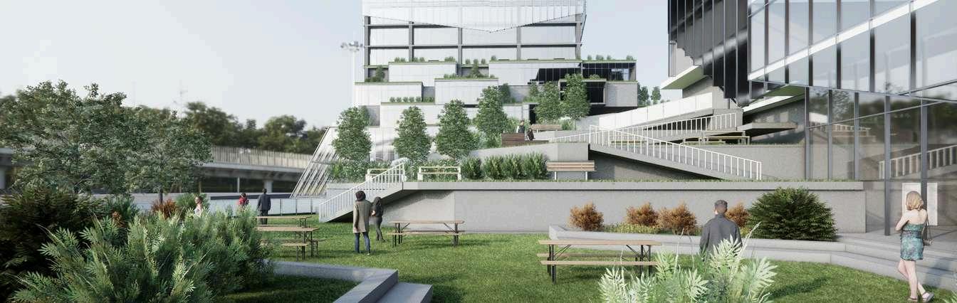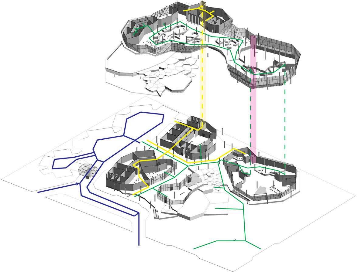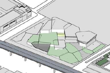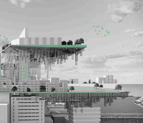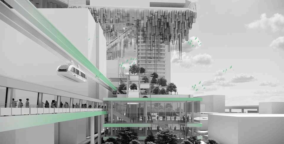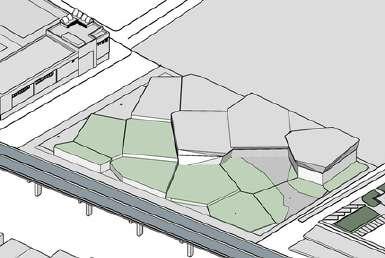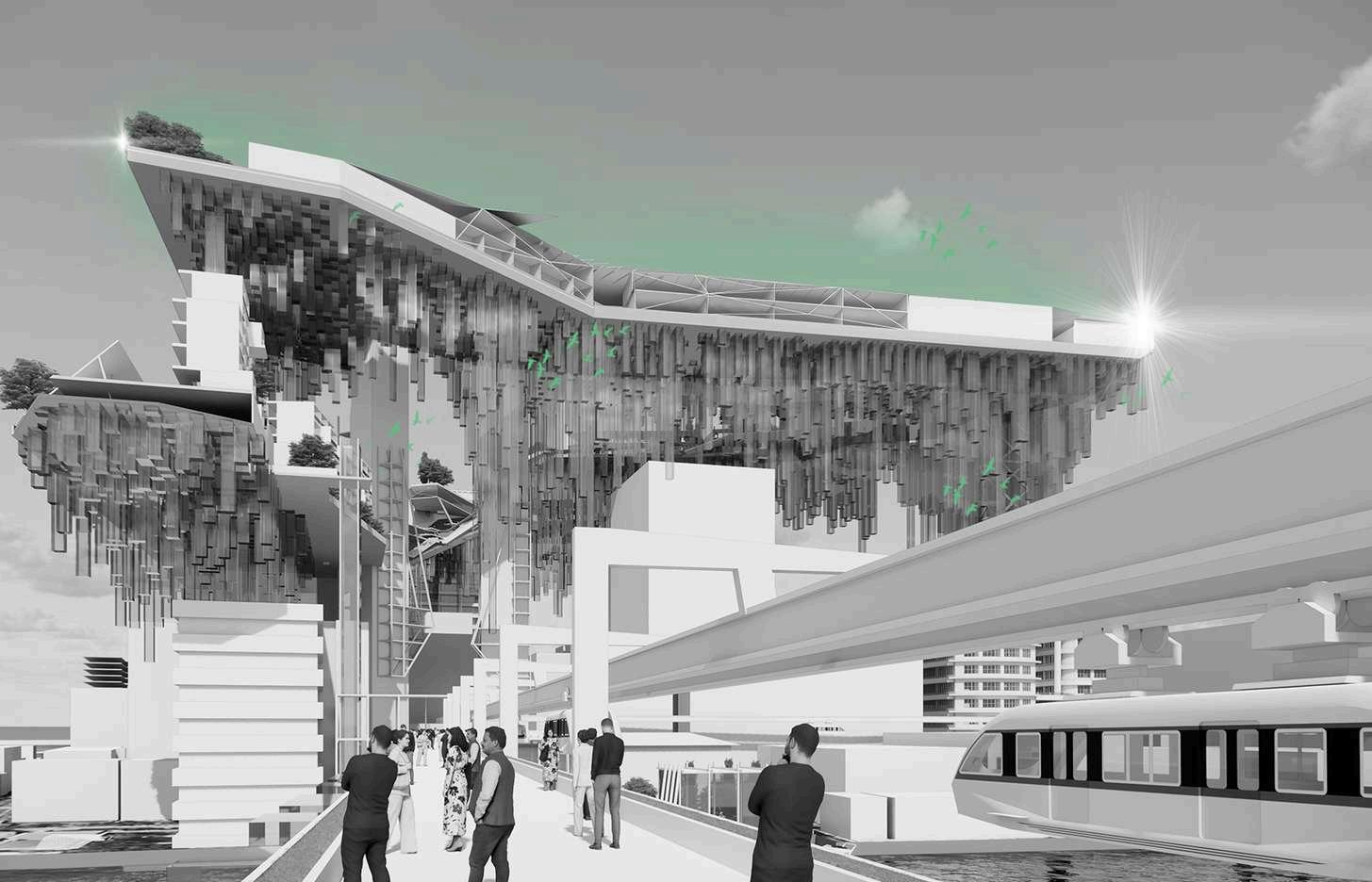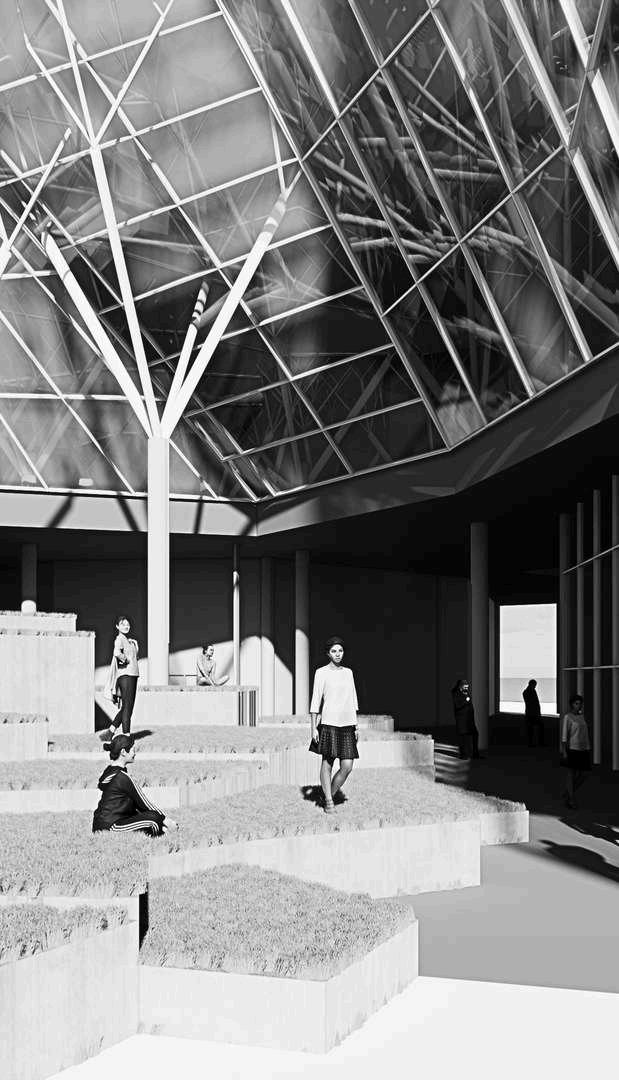 Raise each function in stepped levels. The side facing the terminal opens into a plaza that draws people inside, with a garden that gradually rises from the ground upward