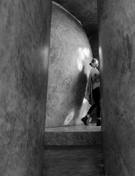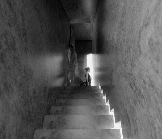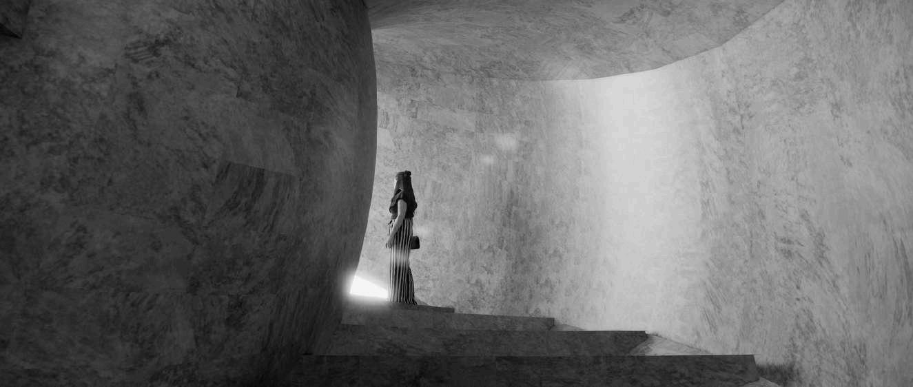 The cave entrance guides visitors into an immersive walking experience At the end of the passage, a staircase leads to the first chamber, where light filters from above. The next chamber features small carved openings that create striking beams of light