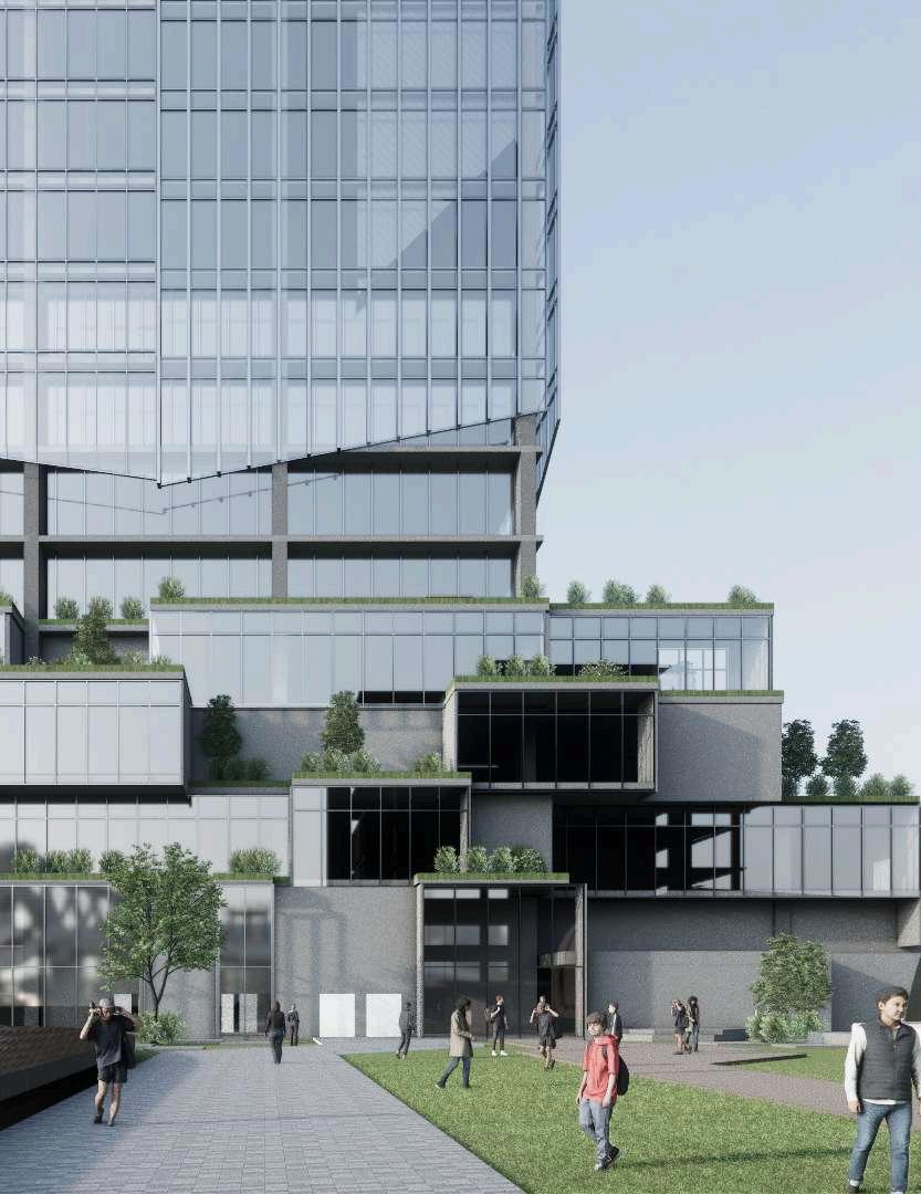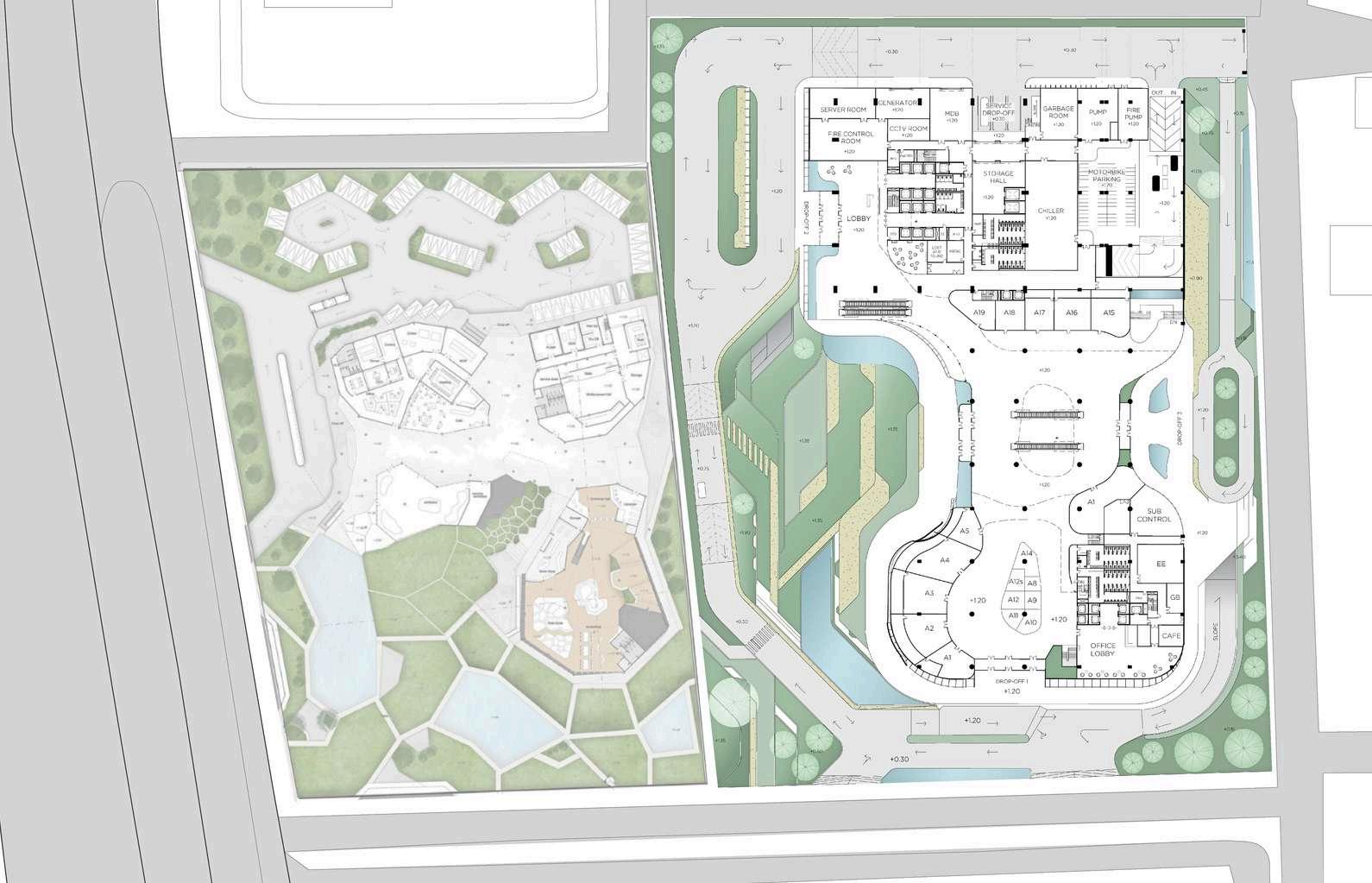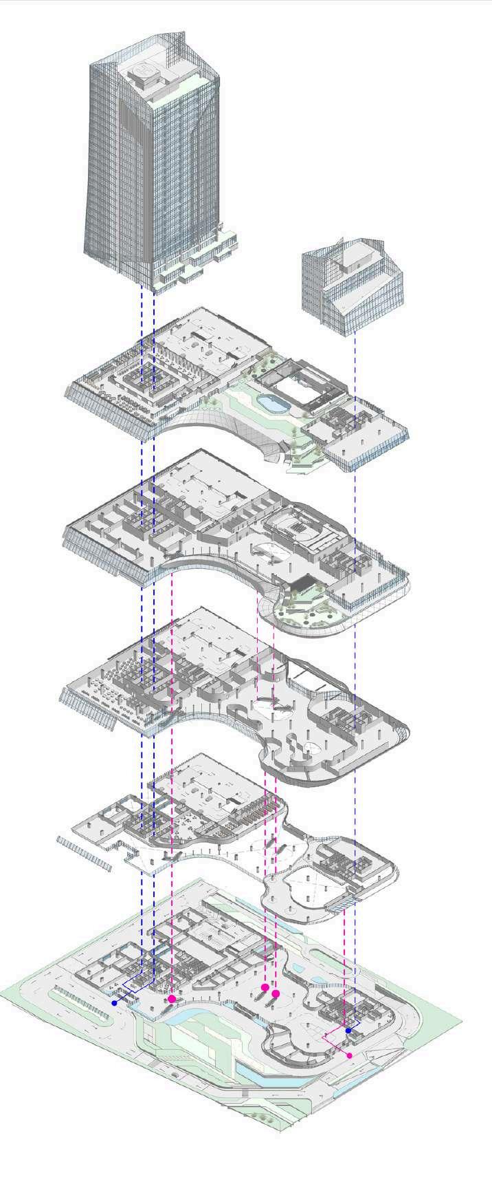 From the plan, there are three drop-off points to help spread out traffic There is one underground parking area and another one on the building, separating office users from retail visitors. A plaza links the library to the project, and the layout is shaped to resemble an electronic circuit
