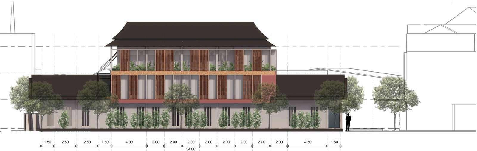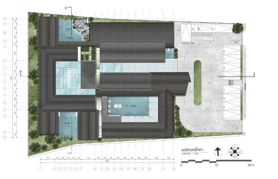 This extended Thai traditional medical center draws inspiration from the unique character of Northern culture, carried over from a previous project’s case study of Wat Chedi Luang The aim is to create a space that shares a similar mood and language From studying both architectural works, two key approaches to expressing Thai identity emerged: through abstract ideas and through physical form The abstract layer, or the essence, reflects the core concepts behind the design. For example, Wat Chedi Luang uses an axis aligned with cosmological beliefs and a symmetrical layout. Similarly, Siripanna adopts ideas from the layout of ancient cities with surrounding moats, using water to evoke lightness and a floating quality.
