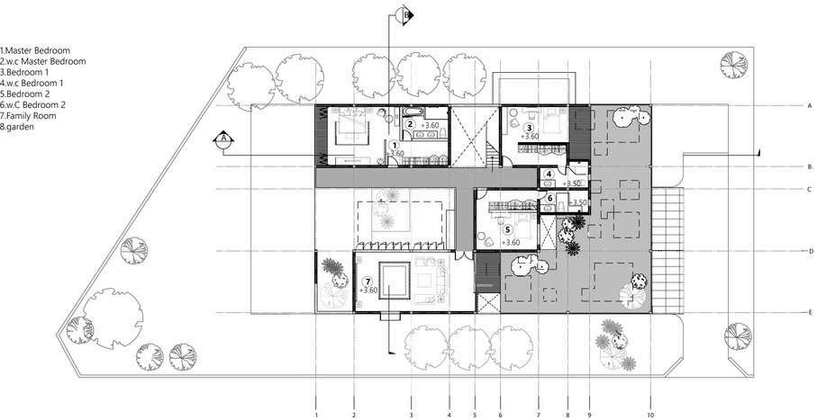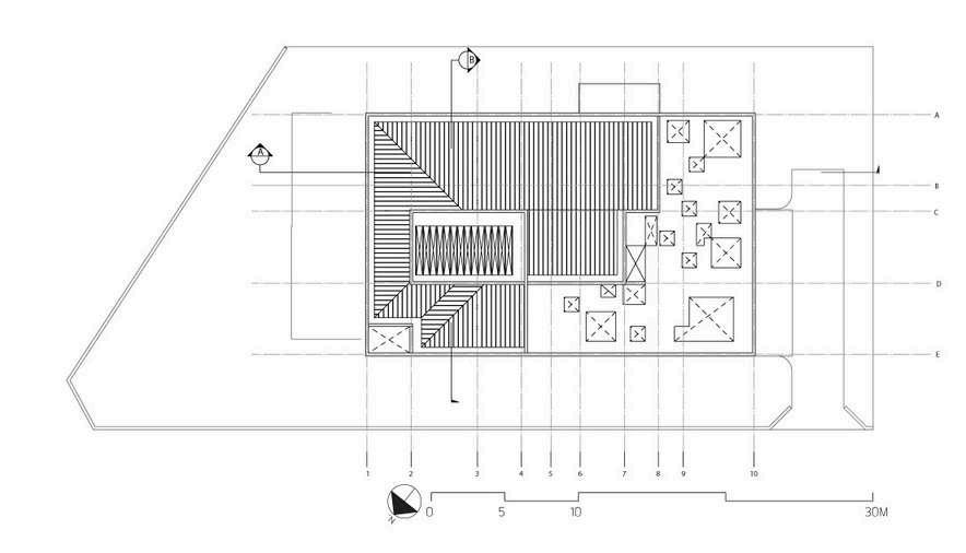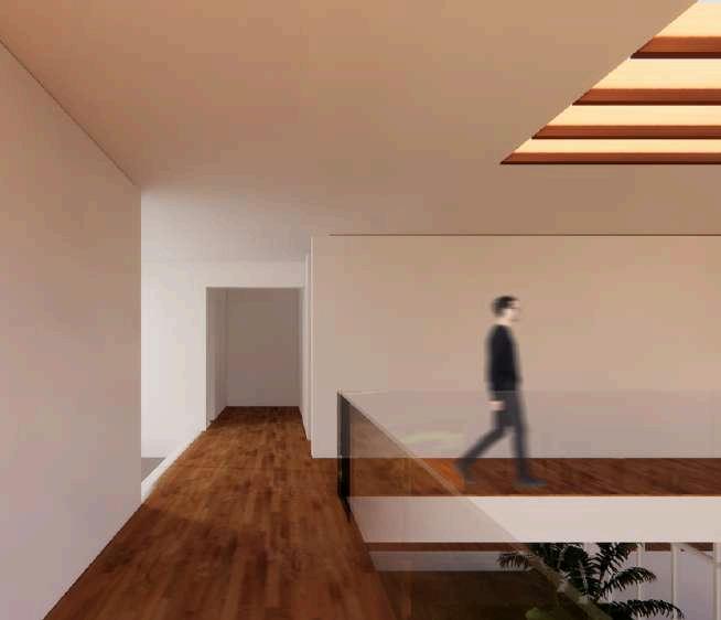 The roof is designed with a subtractive concept, creating carved‐out openings that let sunlight reach the garden below and make the house feel open and airy The covered areas above each room use a parapet roof.