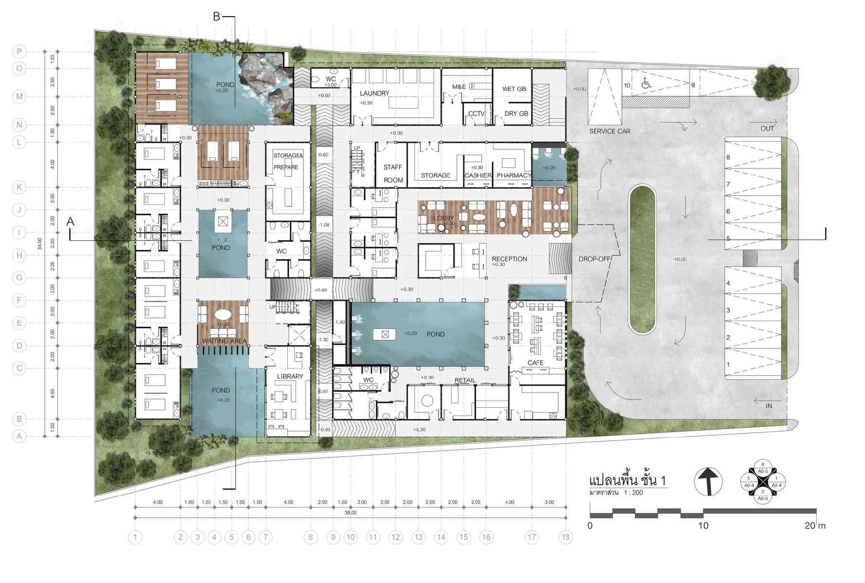 The plan uses a central axis extending from the lobby to the Thai massage area. Water features soften the surroundings, while small courtyards let natural light fall into the lower levels, visible in the left section These appear near the café and the treatment area.