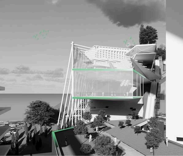 Functions are arranged on rising levels. The area facing the terminal opens as a plaza, guiding people inside, with a garden that slowly builds height along the way