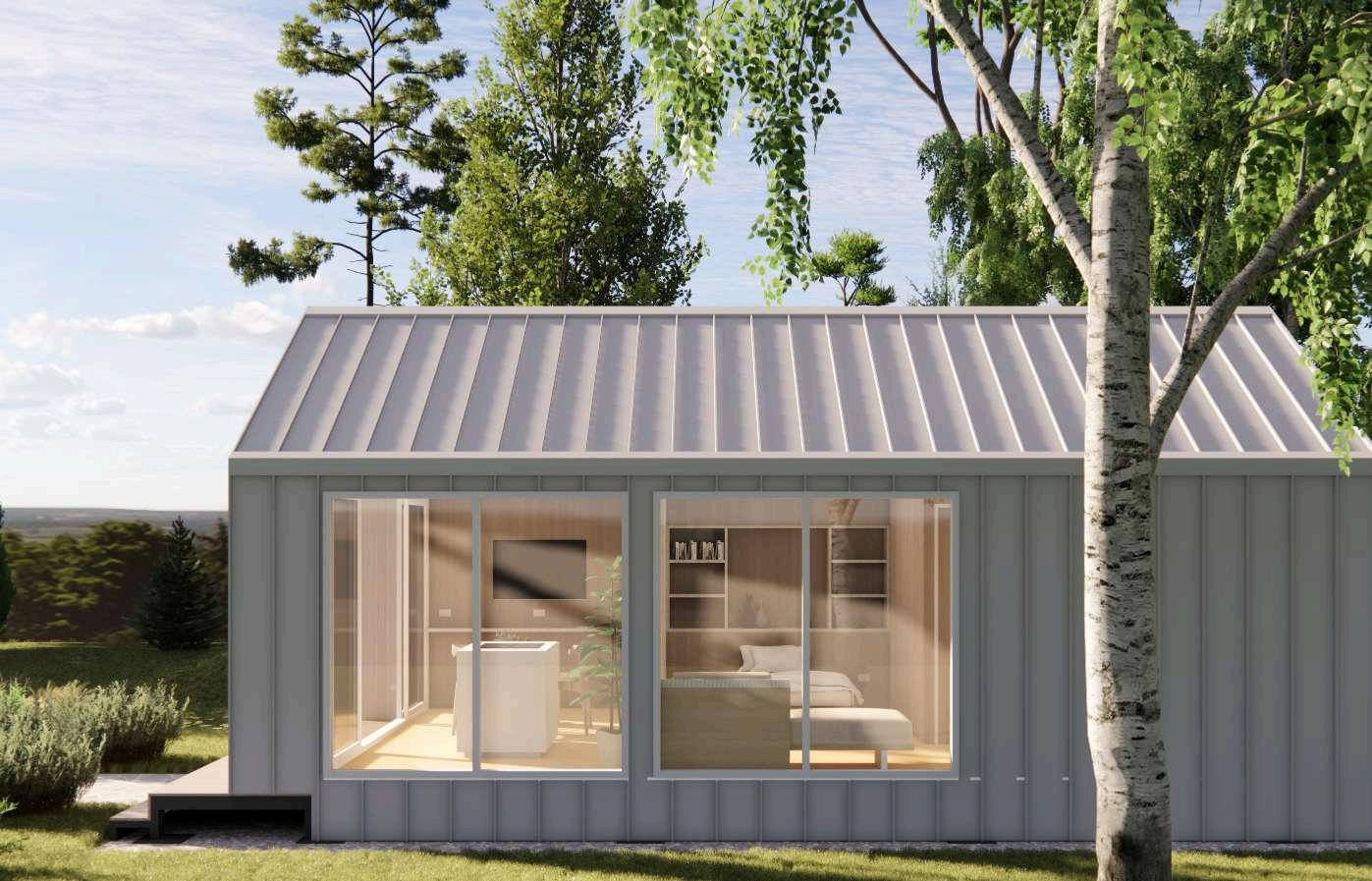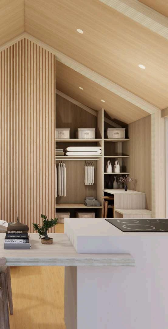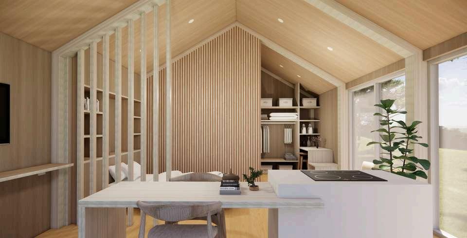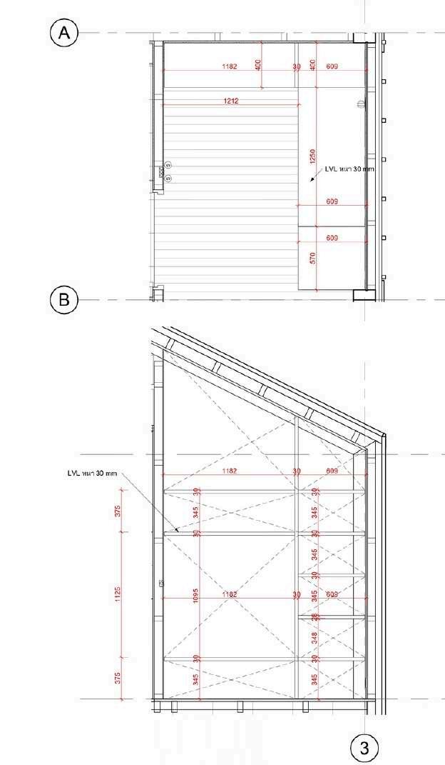 Built with Laminated Veneer Lumber (LVL), this design uses layered timber pressed under heat to create a strong and reliable structural material often used for beams and major supports. The form resembles a nordic‐inspired house, featuring Portal Frame‐style joints. Grooves are integrated for roof purlins and for inserting wall and ceiling boards directly into the frame