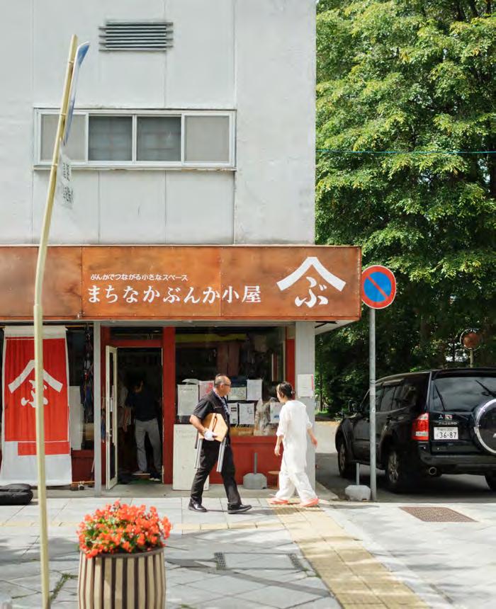 最初に向かったのは、北海道旭川市の中心部にある「まちなかぶんか小 屋」です。旭川駅の北口前からまっすぐ伸びる買物公園通りを 15 分ほど歩 いた先、商店がまばらになり始めた通りに、まちなかぶんか小屋はありまし た。外にはのれんが掲げられていて、赤い布地ののれんに白く大きな「ぶ」 の文字。文化の「ぶ」だとは分かっていても、なんだか怪しい雰囲気を醸 しています。何をしている場所なのか、一見しただけでは分かりにくく、扉 の前で一瞬、立ち止まりました。窓ガラス越しに中を覗くと、カラフルで目 立つ格好をした50 代くらいの女性や、椅子に腰掛けてぼんやり外を眺めて いる高齢者の姿がありました。家にいるのが寂しくて来たという人もいれば、 ただ時間をつぶしに立ち寄ったような人もいる。子どもが遊び、近所のお じいちゃんやおばあちゃんが世間話をしている。目的も立場もバラバラな人 たちが、同じ空間に同時に存在していました。