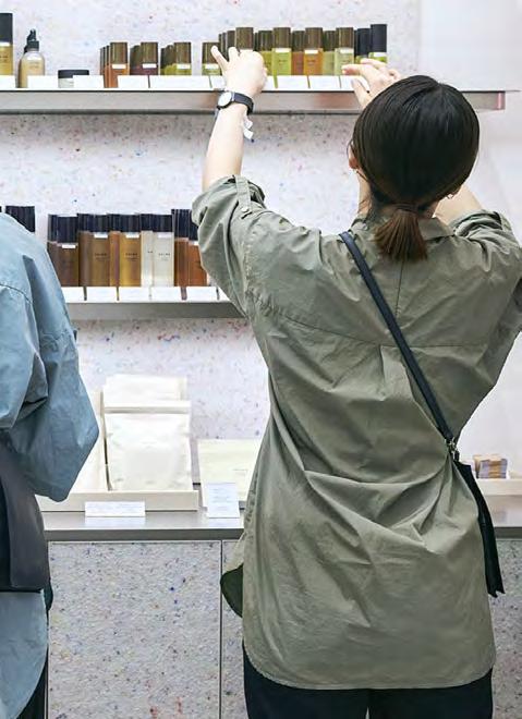 アップサイクル資材使用率 2023 年から取 り組んでいる“捨てない、新たにつくり出さな いお店づくり”。できる限りバージン材を使わ ずに、その土地にある資源を使ってお店づく りをしています。2025 年 12 月に韓国の THE HYUNDAI SEOULで実施したポップアップス トアは、“借りて返す、そして捨てない”とい う考え方でつくりました。全什器15.4 ㎡のうち 72.9% の資材を再活用し、新規でつくったロゴ サインなどは、次のお店で活用します。