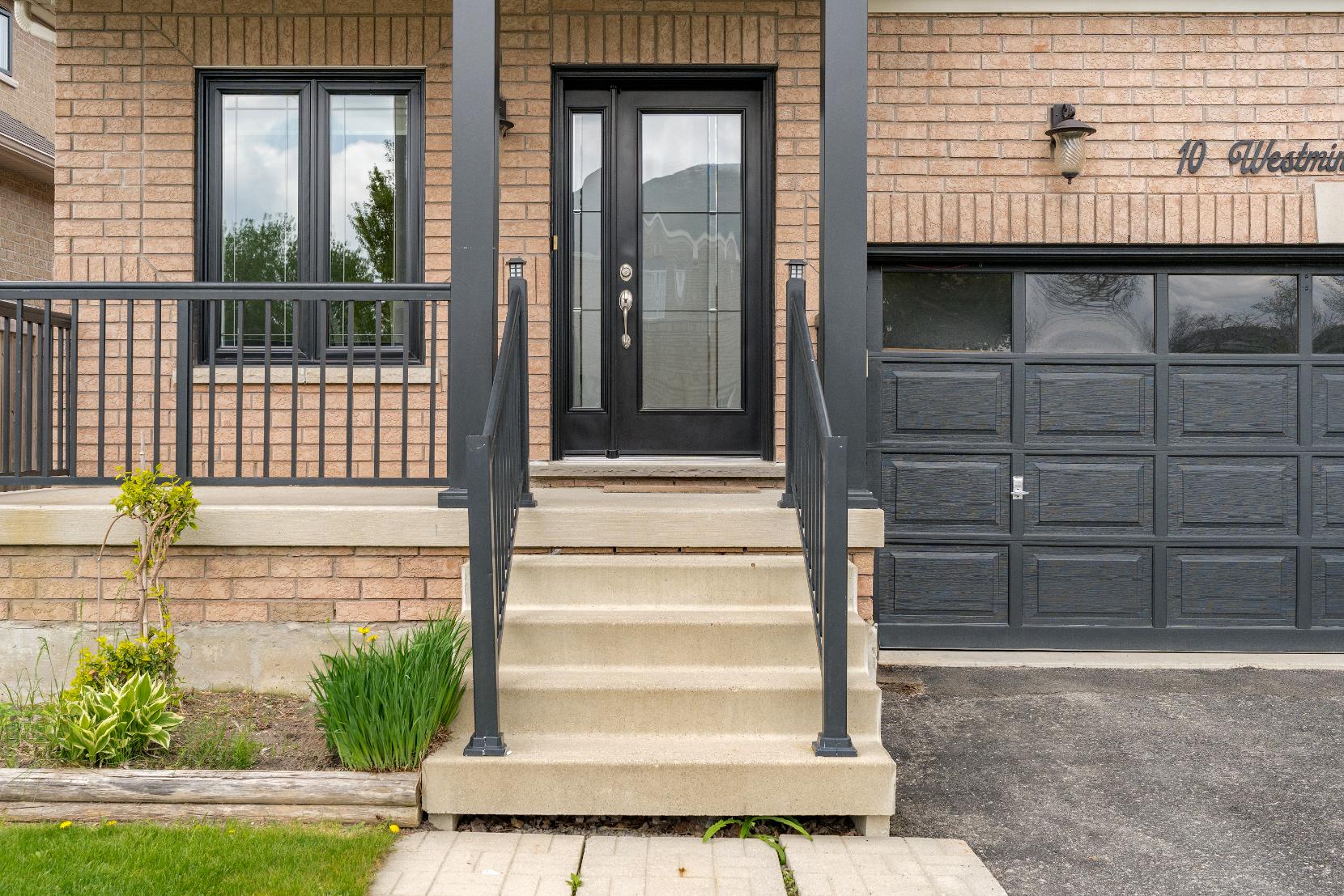 - Ranch bungalowcomplete a solid brickexterioradorned byblack accentsand gorgeousfront landscaping,creating a sharp looking curb appeal