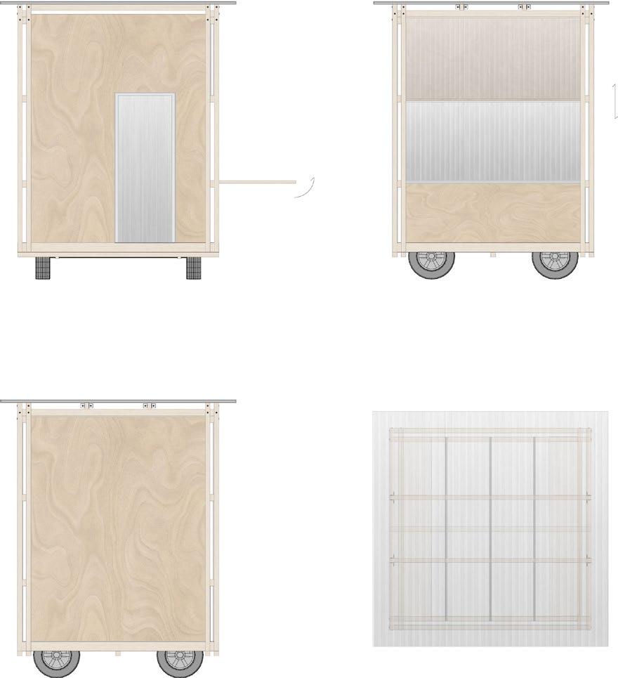 The wooden boxes create a dialogue between materials, connecting the raw, industrial character of the steel structure with a more human scale and tactility. Their mobility and diversity highlight the project’s ambition to be dynamic and functionally adaptive