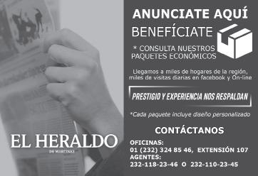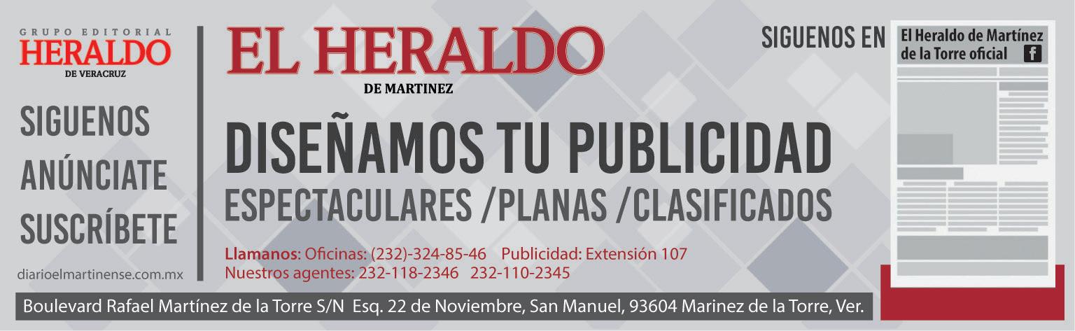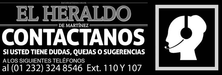 EL HERALDO DE MARTINEZ es una publicación diaria de lunes a sábado. Miércoles 22 de Enero de 2025 | Año 6 | No. 2117 | Editor responsable Ing. Eduardo Sánchez Macías. Número de certificado de Reserva de Derecho al Uso Exclusivo del Titulo 04-2017-090412182000-101. Certificado de Licitud 17081. Certificado de Licitud de Contenido 17081. Domicilio de la publicación, impreso y distribuido por Empresas Franes, S.A. de C.V., con domicilio en Boulevard Rafael Martínez de la Torre No. 168. Esq. 22 de Noviembre, Col. San Manuel, Martínez de la Torre, Ver., C.P. 93600. Tels.:(01 232) 324-85-46, 324-4676, 373-15-95, Fax 324-85-47