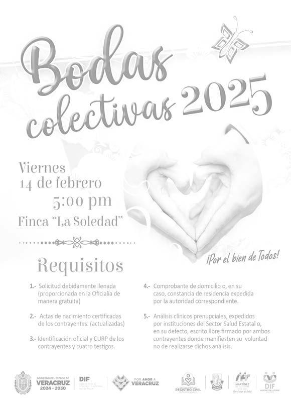 El Ayuntamiento de Martínez de la Torre, el DIF Municipal y el Registro Civil han abierto la convocatoria para que las parejas que viven en unión libre puedan formalizar su relación y participar en las bodas colectivas que se celebrarán el próximo viernes 14 de febrero a las 5 de la tarde en las instalaciones del DIF Municipal, en la Finca La Soledad.