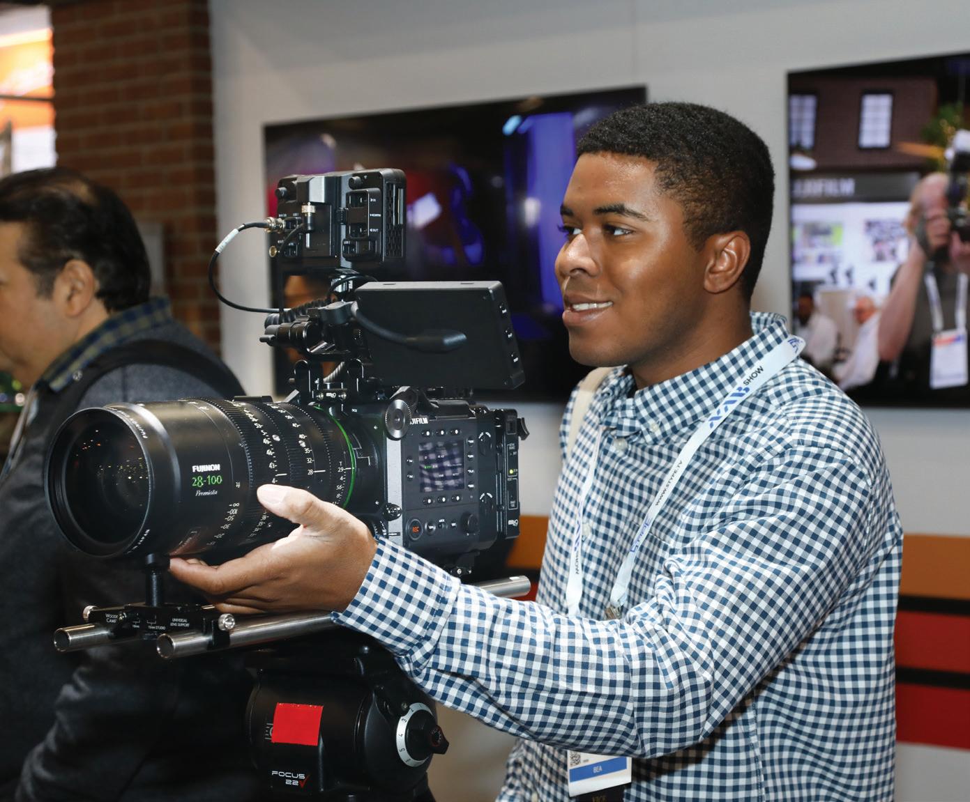Robert James from the University of Montevallo takes a new Fuji lens for a test run at booth C6325. Fuji is highlighting three new 4K-compatible zoom lenses: the FUJINON UA16x4BERD, UA30x7.3BERD, and UA94x8.7BESM.