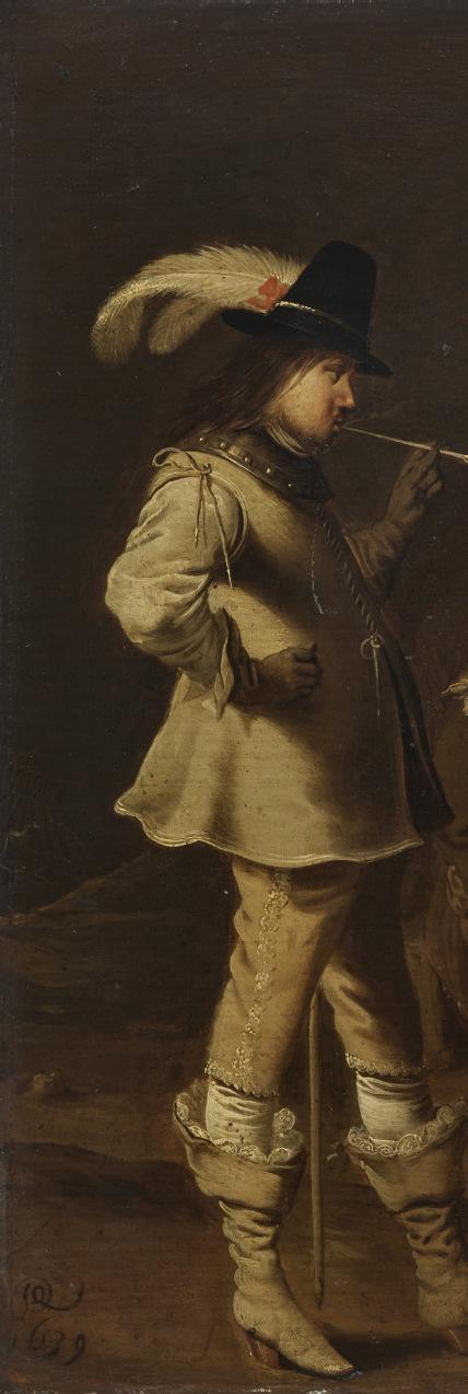 Published by Daniela Semprebene in 2011 as a work by Angelo Caroselli (loc. cit.), this painting, along with its pendant, were excluded from the more recent monograph by Marta Rossetti (M. Rossetti, Angelo Caroselli (1585-1652), pittore romano: copista, pasticheur, restauratore, conoscitore, Rome, 2015). Rossetti considers both paintings to be by the so-called Pseudo-Caroselli (written communication, 19 July 2023). Possibly of French or Flemish origin, but educated in Rome alongside the better-known Caroselli, Pseudo-Caroselli has been the focus of extensive scholarship (see R. Longhi, ‘Ter Bruggen e la parte nostra’, Vita Artistica, II, 1927, pp. 95-116 and V. Sgarbi ‘Pseudo-Caroselli, La morte di Cleopatra’, Quaderni del Barocco - Dipinti inediti del Barocco Italiano da collezioni private, 16, 2012). Due to the varying quality of paintings attributed to Pseudo-Caroselli, Rossetti argues that the pseudonym encompasses more than just one artist active in the ambit of Angelo Caroselli (M. Rosetti, I pittori della luce: da Caravaggio a Paolini,V. Sgarbi ed., exhibition catalogue, Milan, 2021, pp. 139-141). She further notes that the roughly thirty paintings ascribed to PseudoCaroselli are linked by moralizing—often necromantic and erotic—themes and are frequently executed on less common supports, such as slate and copper. This rosy-cheeked couple painted on slate is therefore a typical example of PseudoCaroselli's work.