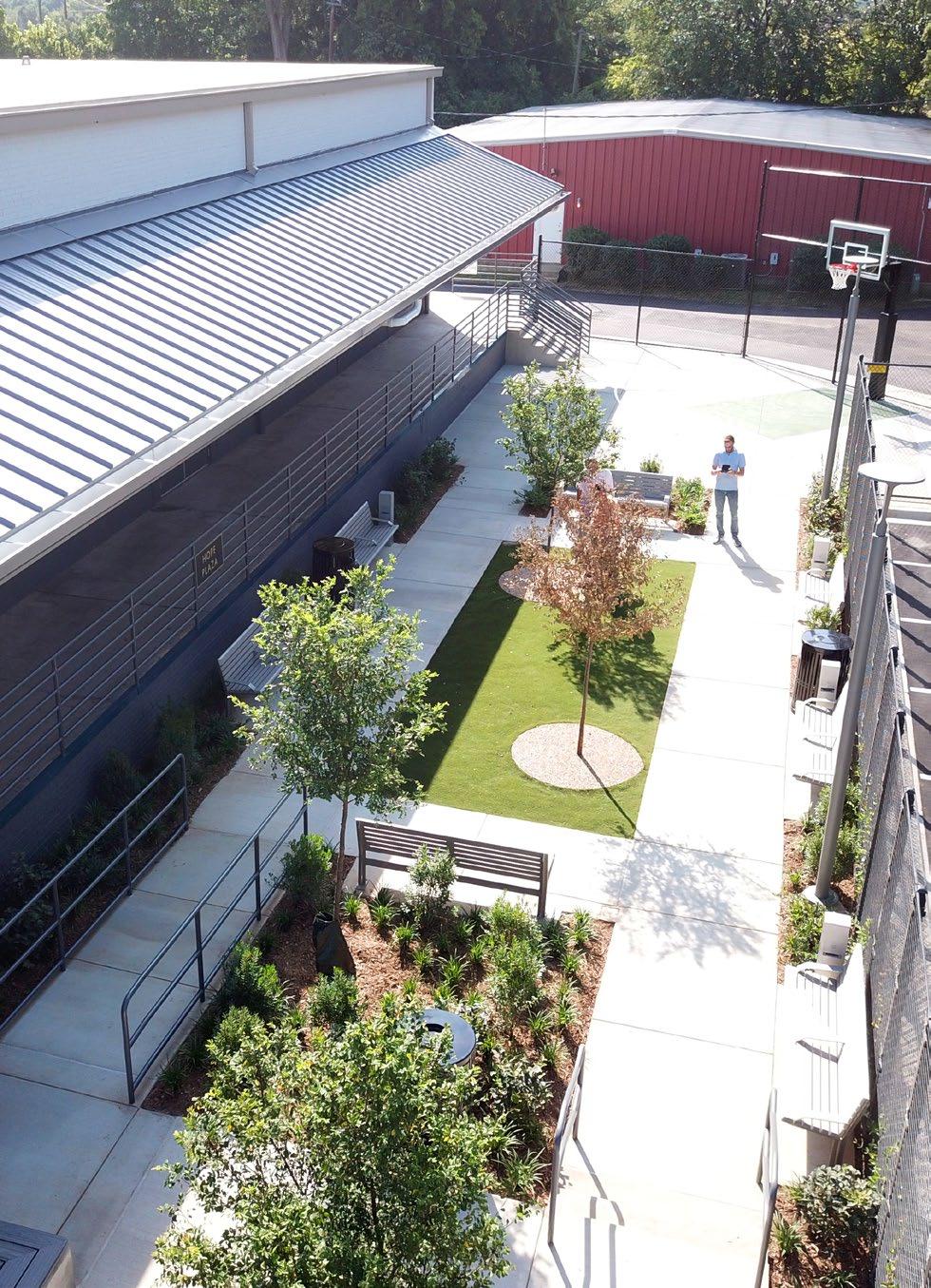 Hope Plaza provides a protected outdoor space that allows residents at the Men’s Shelter to relax during off-hours when the shelter is closed. The space is divided into three zones – an outdoor eating plaza covered with shade sails, a park like setting with benches and landscaping, and an active play zone with a small basketball court.