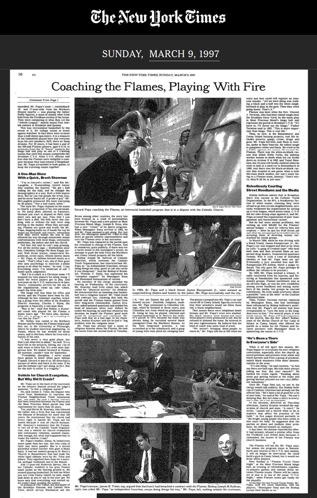 The New York Times covers Gerard Papa's work leading the Flames basketball program in Brooklyn. Papa, a Wall Street attorney and the program's founder, built a coaching culture that prioritized character, integration, and community over wins, a philosophy that kept the Flames relevant and respected for over four decades.