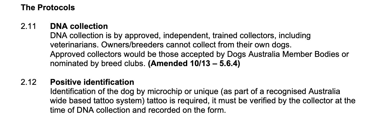 Breeders often have different DNA profiles for their dogs as a result of additional Disease testing. Using the DNA profile with the Approved Collection Method will assist in streamlining the registration processes.